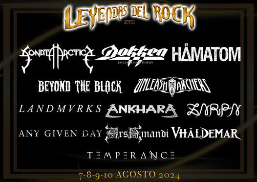 Pisarán por primera vez las tablas de Leyendas Del Rock los alemanes BEYOND THE BLACK y ANY GIVEN DAY, los canadienses UNLEASH THE ARCHERS, los franceses LANDMVRKS y los italianos TEMPERANCE representando todos ellos, un abanico de estilos que abarca desde el Metal Sinfónico hasta el Metalcore más enérgico pasando por el Heavy clásico o el Power Metal.