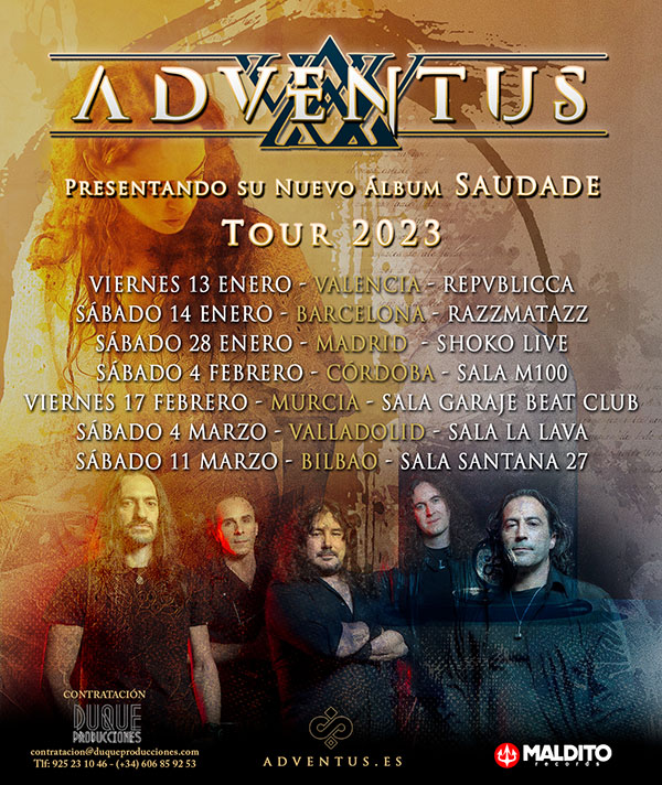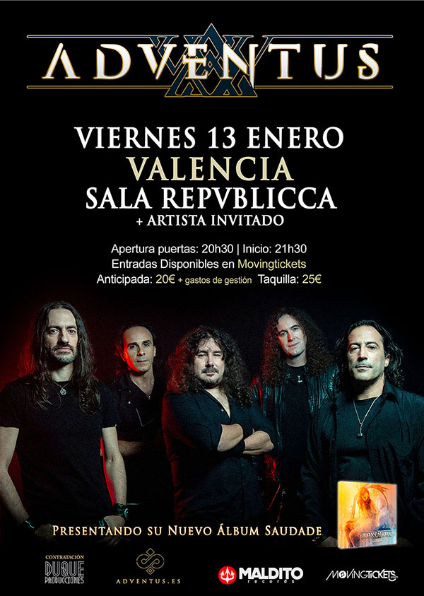 ADVENTUS, la banda de Heavy Metal asturiana, volverá a girar por las salas del territorio nacional defendiendo su nuevo álbum de estudio titulado Saudade. La banda metalera regresa a los escenarios con un directo potente en el que se incluirán los temas nuevos junto a los del anterior disco. El lugar elegido para comenzar la gira Saudade ha sido la ciudad de Valencia, concretamente la mítica Sala Repvblicca el próximo viernes 13 de enero.