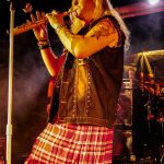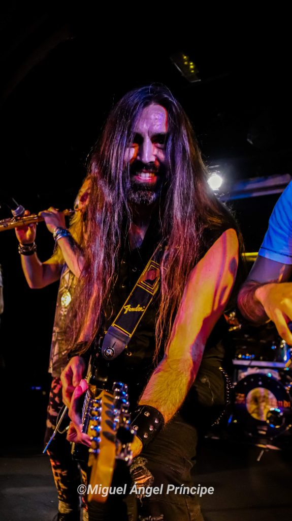 “Desterrado De Tu Cuerpo” y “El Viajero” siguieron dando tralla a una noche en la que Aller combinaba magistralmente sus instrumentos de viento con una voz trabajada, aportando luz a las partes más Folk no como adorno sino con personalidad y junto al virtuosismo de un violín incansable que por momentos tomaba la batuta del grupo con actitud y sonidos pegadizos, realizando dúos con la dulzaina que no restaban dureza a las canciones, encargándose Dani Aller de terminar con un DO de pecho imparable el “Desterrado De Tu Cuerpo” para dar paso al octavo tema de la noche, “Viriato”, perteneciente en este caso al nuevo álbum con final inesperado a medio tiempo rememorando al líder lusitano convertido en héroe histórico por su valor en la lucha.