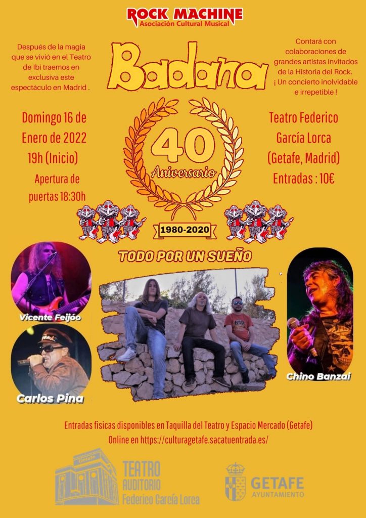 Los alicantinos BADANA de la mano de la Asociación Cultural Musical Rock Machine, celebran su 40 aniversario en el teatro Federico García Lorca de Getafe el domingo 16 de enero a las 19 h, con la participación de grandes invitados de la historia del Rock de este país como Carlos Pina. Vicente Feijóo y Chino Banzai. En lo que promete ser un concierto inolvidable