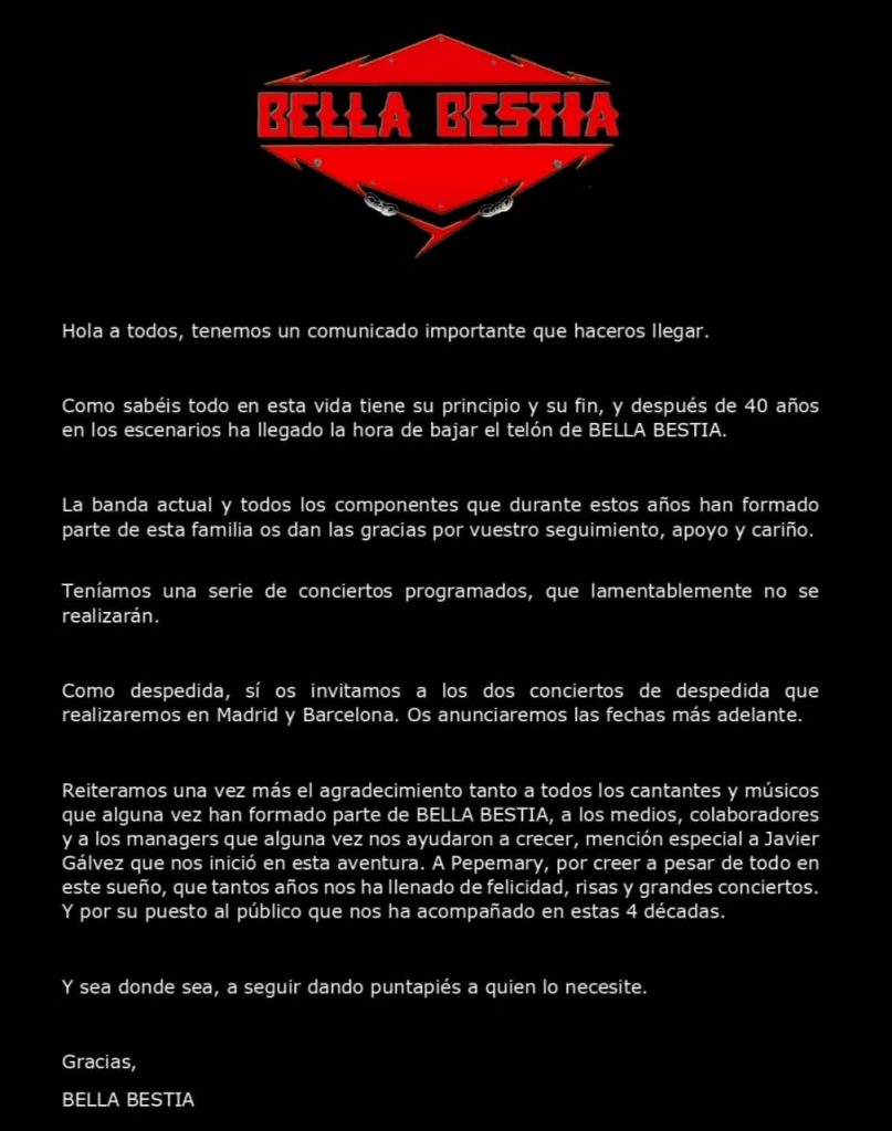 Cuando aún estamos digiriendo, la noticia del adiós de ASFALTO, un post en la redes sociales de BELLA BESTIA anunciando un comunicado a las 20 h, nos dejaba con la intriga, ¿Será tal vez la fecha de ese esperado gran concierto del 40 aniversario?. Desgraciadamente la realidad era otra, suponemos que tras una decisión meditada y difícil de tomar, la banda anunciaba el final de su carrera con dos grandes conciertos de despedida en Madrid y Barcelona, de los que os iremos dando cumplidas noticias en cuanto tengamos información. Desde Reino de Sueños, queremos mandar un fuerte abrazo y todo nuestro animo a la familia de BELLA BESTIA, que tan buenos momentos nos han hecho pasar y de manera muy especial a Pepemary, al que esperamos poder dárselo personalmente muy pronto.