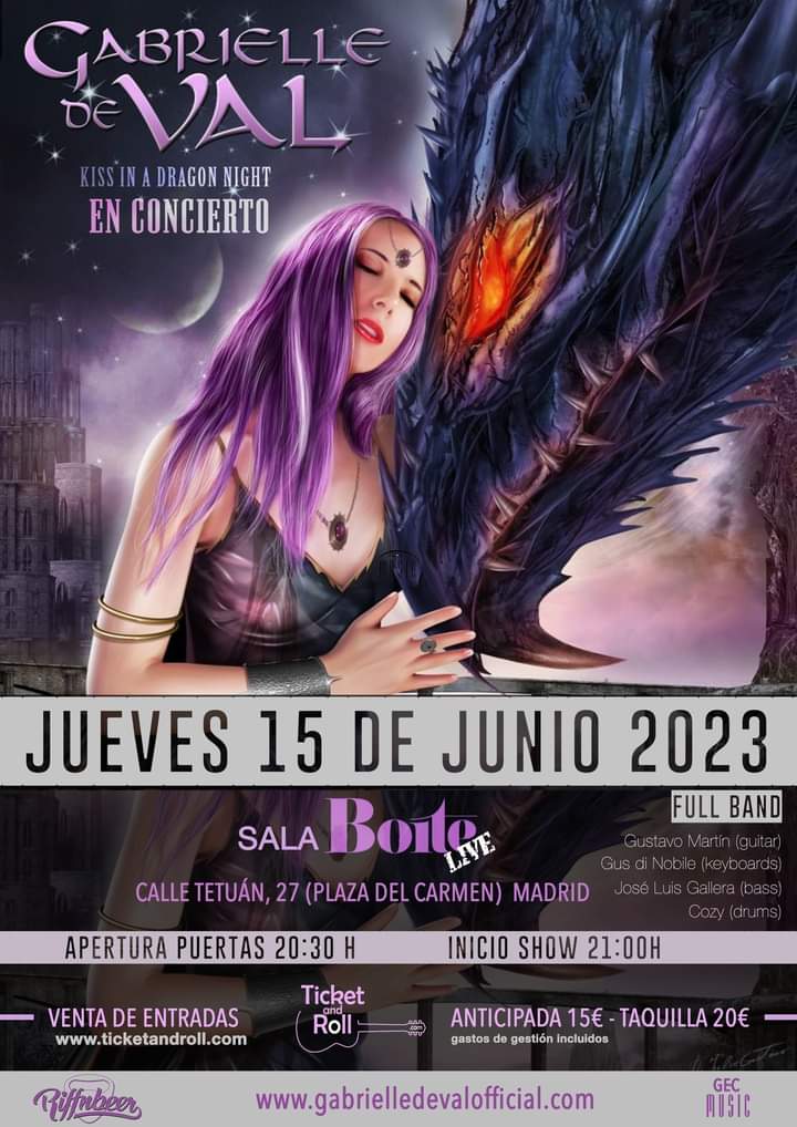Tras una larga y fructífera trayectoria profesional que comenzó allá por el año 1987 con participación incluida en el mítico concurso Villa De Madrid y recorrido por diferentes formaciones como fueron YIN-YANG, D’VAL o THE VAL, la excelsa vocalista Gabrielle De Val presentará su disco en la madrileña Sala Boite el jueves 15 de junio rodeada de músicos de primer nivel que la acompañarán sobre el escenario para dar vida en directo a su primer trabajo en solitario de título Kiss In A Dragon Night, un redondo con doce pistas en su interior que ha sido defendido no hace mucho en Rueda De Prensa en la SGAE Presentación del último trabajo de Gabrielle De Val titulado Kiss In A Dragon Night (16-02-2023) – Reino de Sueños (reinodesuenos.com) y al que le ha llegado el momento de ser intensamente desgranado en vivo.