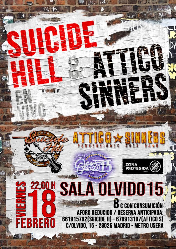 Las jóvenes pero veteranas bandas SUICIDE HILL y ATTICO SINNERS descargarán todo su potencial rokero el próximo viernes 18 de Febrero en la Sala Olvido 15 a partir de las 22 horas.