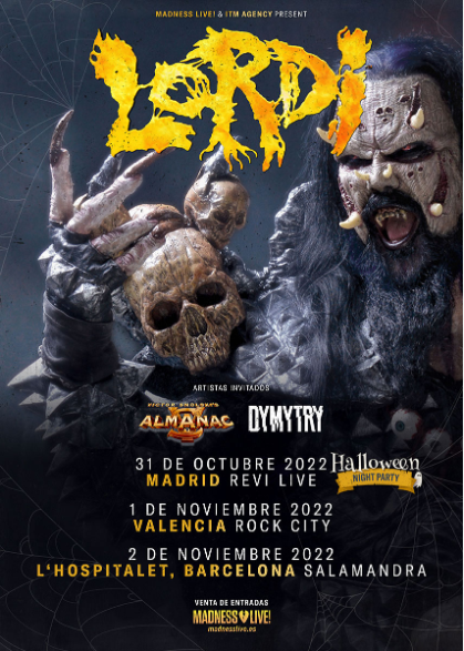 Sold Out casi quince días antes del evento que promete ser uno de los más importantes del año en la capital gracias a las tres súper bandas que lo conforman, un show especial que tendrá lugar en una night party tan señalada como lo es el 31 de octubre víspera de todos los santos y que contará con LORDI, ALMANAC y DYMYTRY, tres formaciones que llegan a nuestro país con varias fechas de la mano de Madness Live & ITM Agency para descargar primero en Madrid (Sala Revi Live) una buena dosis de Heavy Metal, Hard Rock, Metal Moderno y Metal Sinfónico con apertura de puertas a las 19:00 horas.