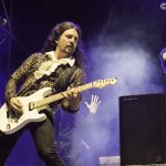 “Resacosix en Pandemia” con Erik a cargo de la voces retomaba el ritmo del concierto  «La Danza del Fuego»  en un nuevo relevo por parte de Tete en la parte vocal en lo que seria una constante de la noche con cambios constantes de vocalista “La dama del Mar” con una soberbia interpretación por parte de la pareja formada por Erik y Xana daba paso a un pequeño solo de bajo por parte de Fernando Mainer ejercía de preludio para uno de los grandes momentos de la noche con Patricia visiblemente emocionada interpretando “El aplauso herido”  esperemos que sus sensaciones fueran tan buenas como las que nos trasmitió a todos los presentes escuchándola y pronto la tengamos totalmente recuperada sobre el escenario.  El siguiente tema “El poema de la lluvia triste” comenzaba con la magnifica voz de Alba encargándose de la parte lirica y  Ruben Kelsen que se sumaba en ese momento a la lista de cantantes que desfilaron por el escenario.