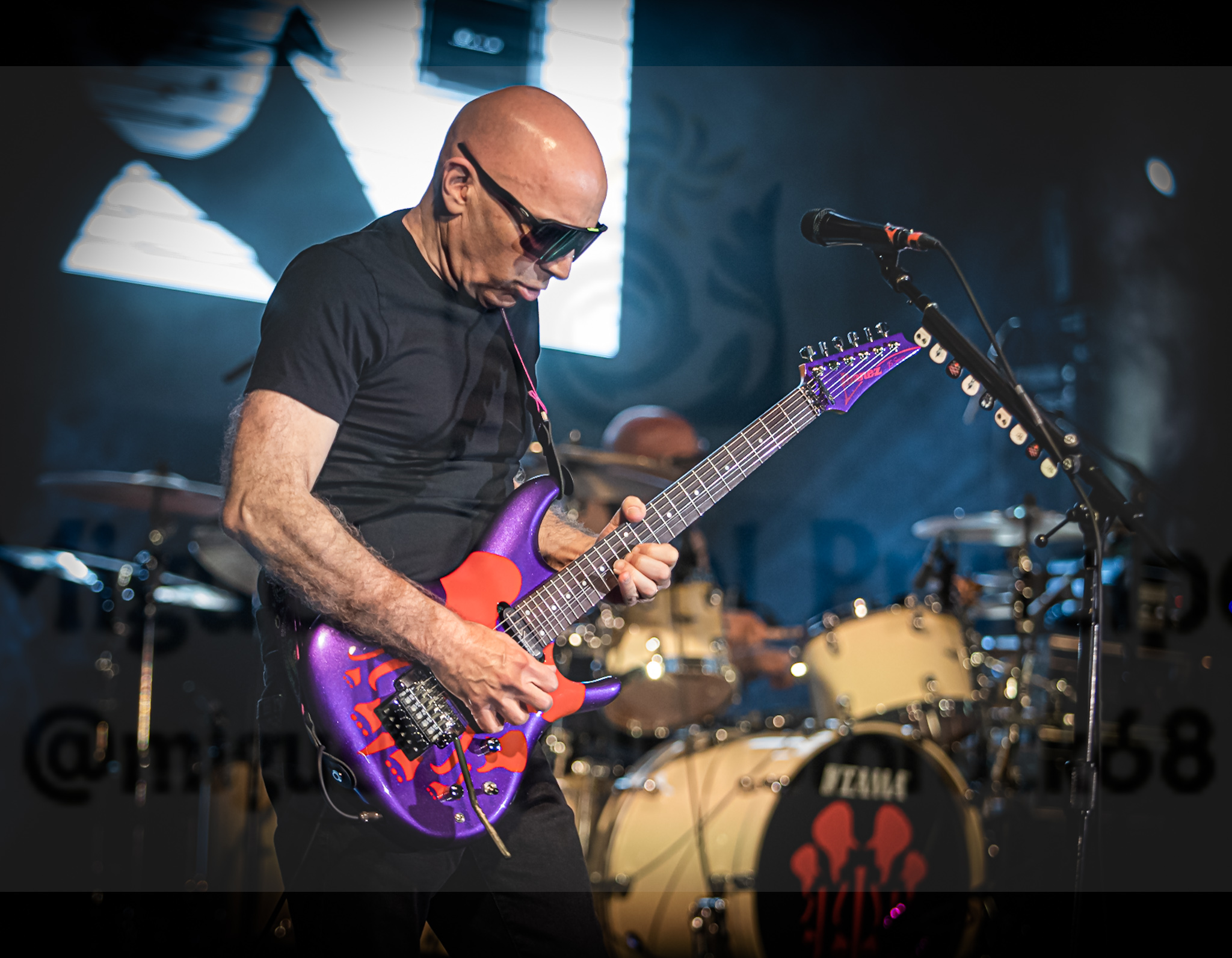 A las 20:05 horas de la tarde y vestido de negro, apareció en el escenario Satriani con una guitarra violeta y roja bastante llamativa de la que salieron los primeros acordes del “Nineteen Eighty” que a pesar de ser relativamente reciente, tiene el sabor y el estilo de esos clásicos que le encumbraron en los ochenta. El sonido de su instrumento fue muy claro y nítido, casi como el del resto de su banda … bueno, el teclado sonó un poco bajito pero eso es algo a lo que ya estamos bastante acostumbrados. “Sahara” cambió el ambiente con su psicodélico comienzo que se fue tornando en un estilo más melodioso para continuar con su último trabajo gracias a “The Elephants Of Mars”, acompañado éste con el videoclip de la canción proyectado desde una pantalla situada al fondo del escenario como único elemento del montaje escénico y concluyendo el final con un solo espectacular para, tras cambiar a una Ibanez (como todas) roja, presentarnos a la banda: el experimentado Kenny Aronoff a la batería, Bryan Beller tanto al bajo como tras los teclados y acompañándole ocasionalmente a la guitarra Rai Thistlethwayte.