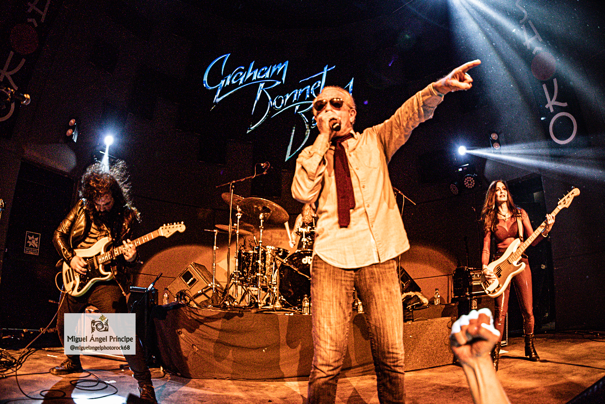 A las nueve y diez de la noche, sin la previa presencia de telonero, o grupo invitado, aparecía la banda sobre el escenario y de nuevo Bonnet tenía que luchar contra un concepto que tienen los fans más puristas: el sonido se su propia banda. En la época más exitosa del cantante nunca ha sido el líder indiscutible del grupo. Siempre ha tenido que compartir protagonismo con guitarristas muy ilustres (Blackmore, Schenker, Malmsteen, Vai…) y todos y cada uno de ellos poseen un sonido tan personal como su voz. Ahora luce apoyado en dos fieles escuderos: su bajista y pareja sentimental desde 2012 Beth-Ami Heavenstone, y su guitarrista de origen brasileño Conrado Pesinato. Ambos se encargan de algo más que salir a tocar acompañando a la estrella, además son responsables de la producción y de que lo que suena sea acorde con lo que se espera de alguien que ha sido vocalista de históricas bandas de Rock.