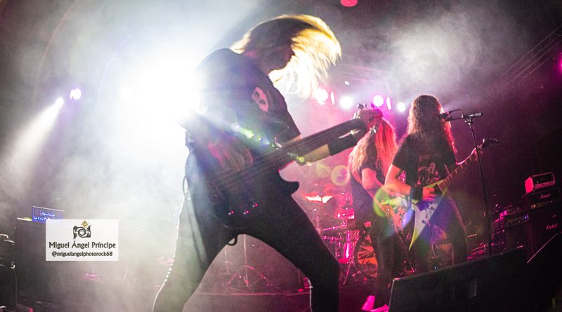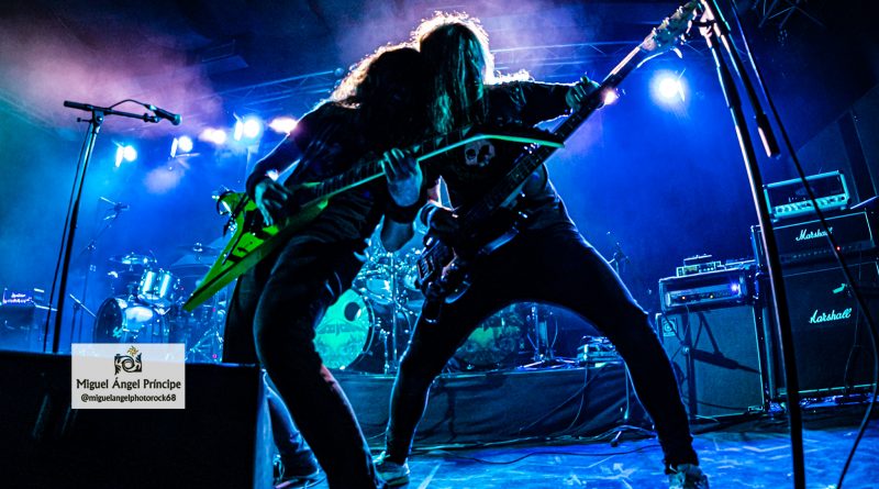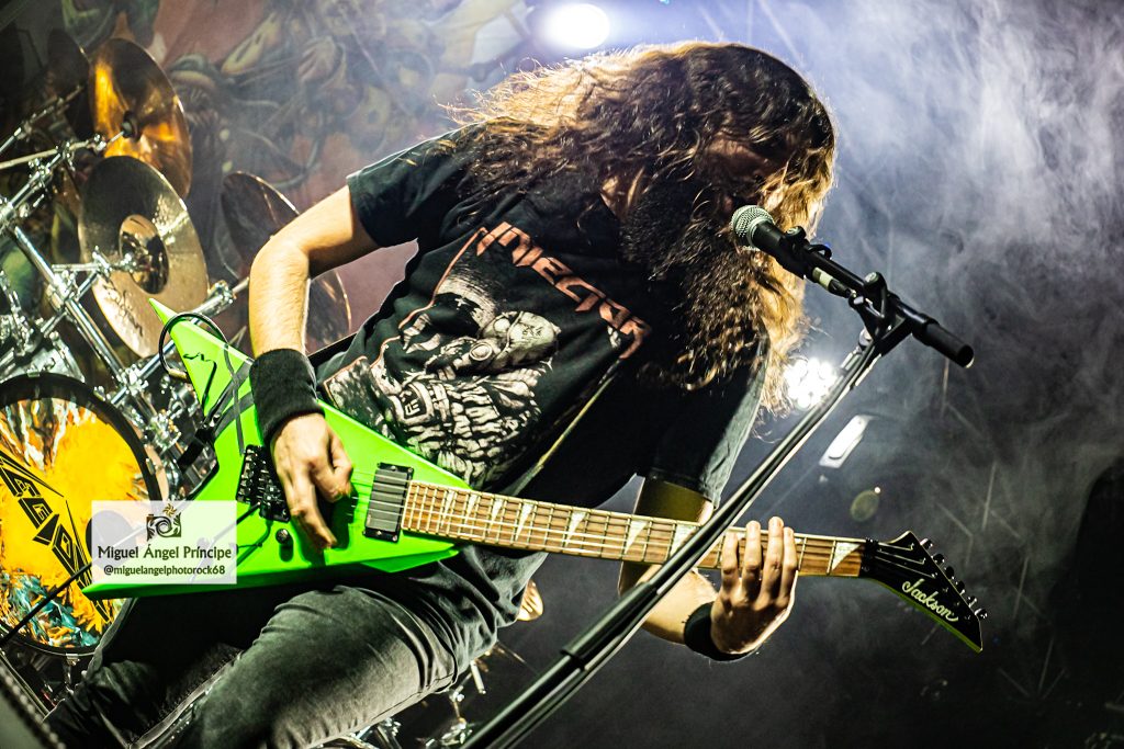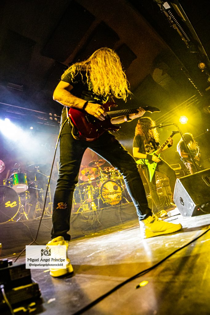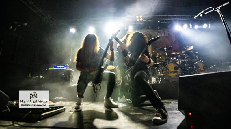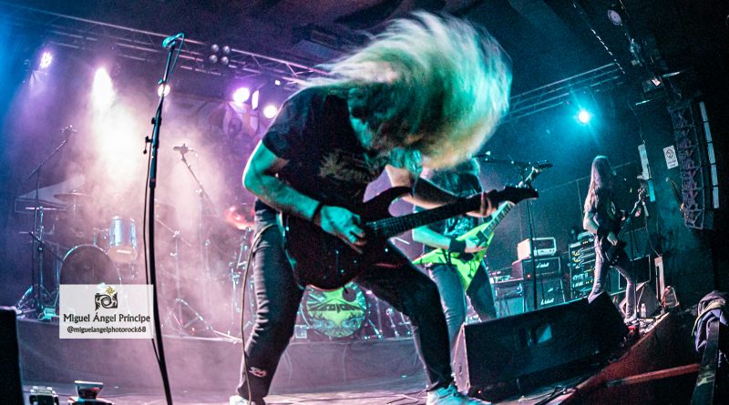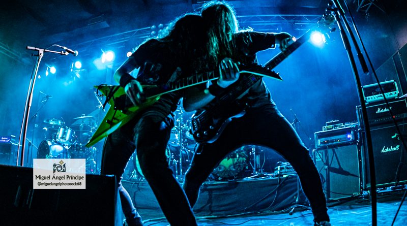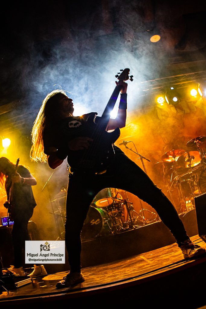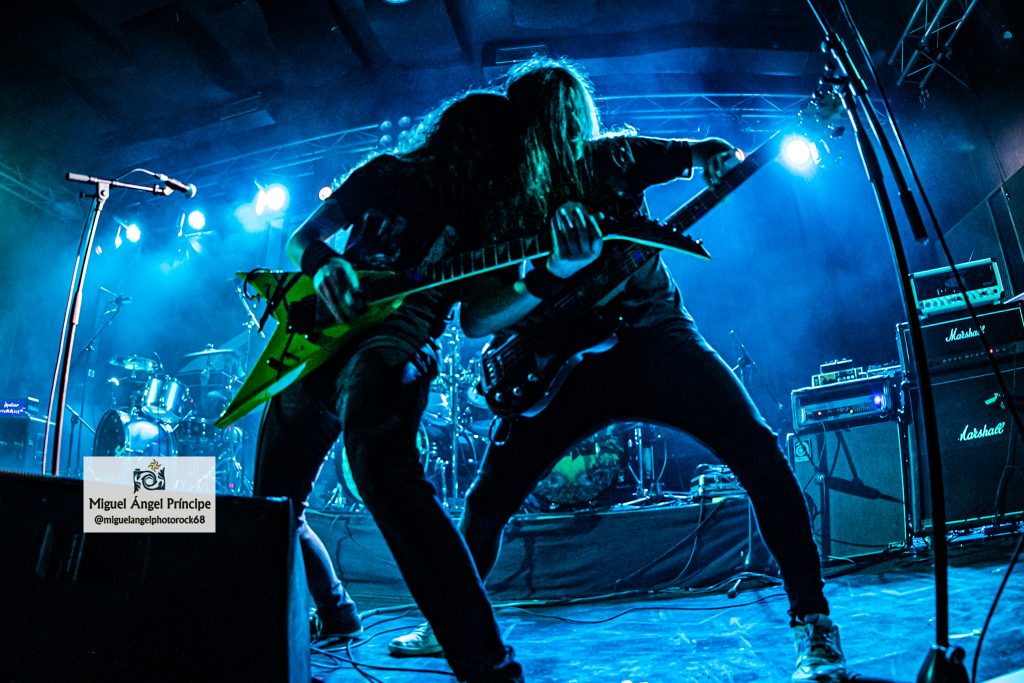 No tardaron en llegar los pogos ya esperados desde el comienzo e imprescindibles para mostrar el respeto a la banda desde la arena mientras ésta se mantenía ocupada con «Unborn Legions», «Oppressive Force» o «Last Day Of Greed», auténticas composiciones de ritmo embriagador que en el caso de la primera nos dejaron admirar ese cambio de ritmo muy del gusto del género con el que pasaron de la cadencia percusionista de un Aníbal en auténtico estado de gracia apoyado por el bajo, a una gestión de rítmica y voz rocosa de elegancia manifiesta mezclada con el mástil de Dani MVN que contó con su compañero ideal en Dani B, una muñeca prodigiosa que «tiró de palanca» para empastar lo que sus dedos gestionaban por otro lado en el mástil generando unos riffs encarecidos que sin prolongarse excesivamente en el tiempo, marcaron los temas dando personalidad a los mismos y una impronta a las seis cuerdas que empastó a la perfección con sus compañeros en una ejecución de arpegios impecable.