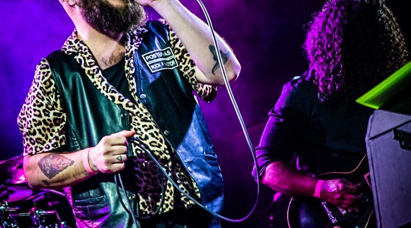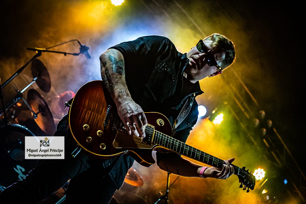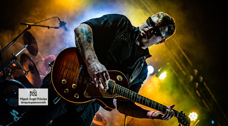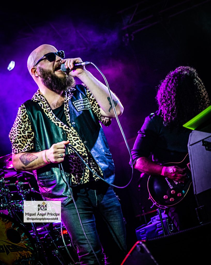 Con estética vacilona al afrontar el evento con gafas de sol como una sencilla pero efectista performance, POSTURAS avanzó en un generoso repertorio de nueve temas desplegando contundencia y demostrando que la experiencia es un grado, una firmeza muy bien acompañada por la envolvente cadencia de un bajo muy presente en el caso de «Mil Galaxias» mientras Adrián, animaba con las notas de sus compañeros de fondo a la gente para que le acompañara en el desempeño vocal, una petición que obtuvo respuesta con palmas en alto y coreado de los estribillos por parte del público especialmente relevante en «Quemando Carretera» o «Huele A Pelea En El Bar» que engancharon con el respetable y que junto a ese efecto tan gamberro que destila el grupo, aportaron una extraordinaria calidad musical para temas de composición elaborada que fueron perfectamente ejecutados sobre el escenario, algo a lo que la química establecida entre todos ellos junto con los fieros solos de «Pipe» dieron el punto más duro a ese Rock que gusta del ritmo de Gabriel para acompañar a esos riffs que apuntaron al cielo, gestionados los mismos con afilada destreza por parte del primero a la vez que con buen gusto y que sin duda suponen una de las notas identitarias de POSTURAS, un quinteto que combina como pocos las tonalidades rocanroleras con los tintes de asfalto que esa voz abrupta del vocalista gestiona cada vez que aparece.