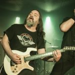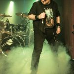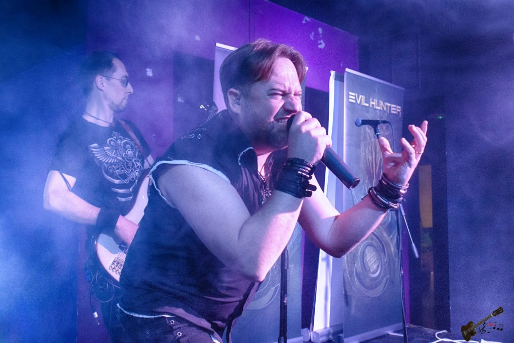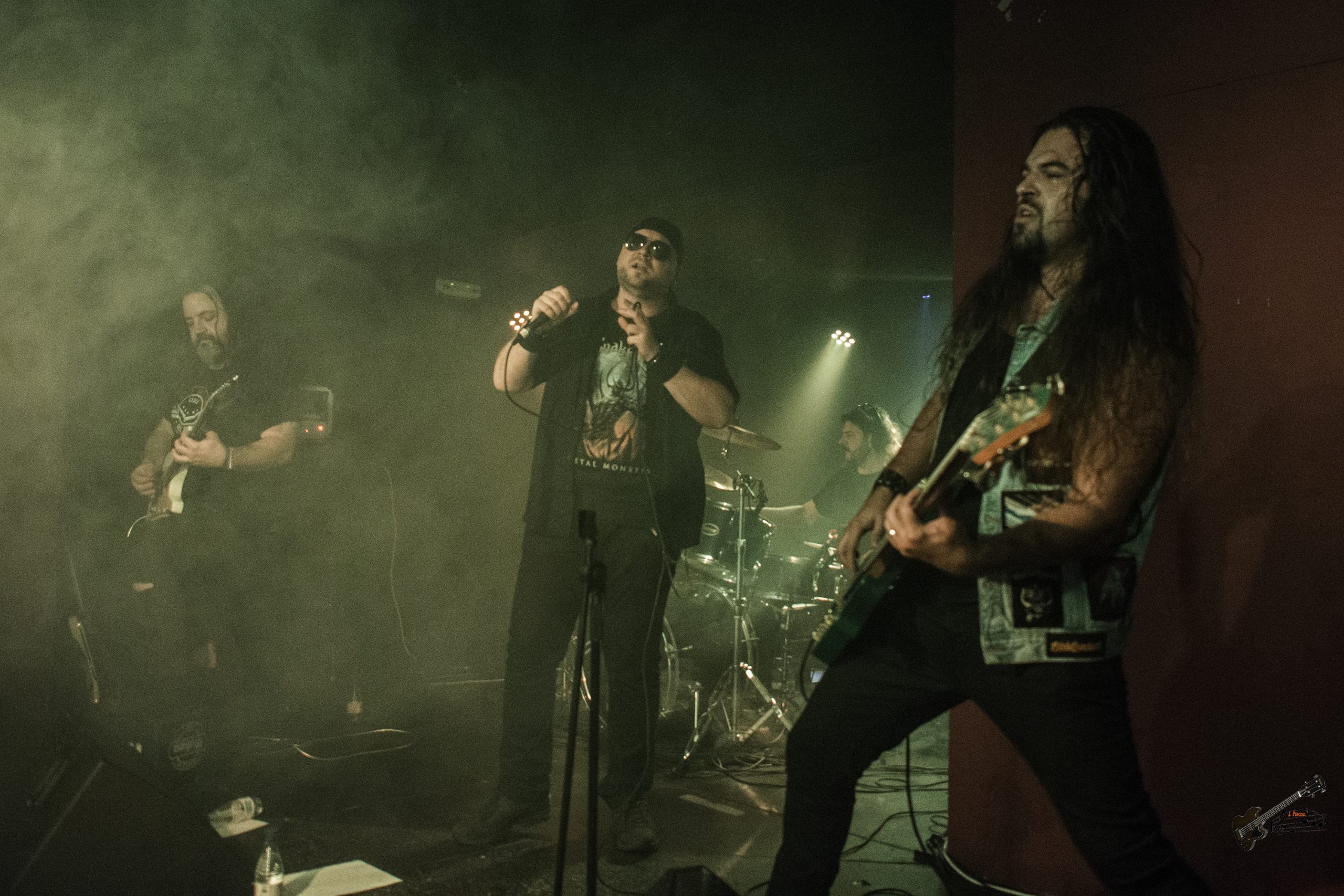 Afortunadamente en cuanto EVIL HUNTER pisaron las tablas del escenario la espera se vio rápidamente compensada. Encadenando dos auténticos trallazo de Heavy metal «Guardian ángel» y «Evil Hunter«, he de decir que la banda sonaba ya desde estos primeros momentos como un autentico cañón con un un especial protagonismo de la guitarras tanto de Robert Beade, como especialmente la de José Rubio Tras ellos Damián Chicano tomaba la palabra para agradecer a todos nuestra presencia y presentar «Your’ll never walk alone» tema contra el acoso con tintes Hard Rokeros. «Beyonf the dark» y «Get up» sonaban a continuación dos temas en los que particularmente la voz de Damián me recordaba en algunos momentos a la de Udo Dirkschneider, la incendiaria «Burning in flames» disparaba la adrenalina con su ritmo endiablado. «Heartbeat» mantenía las pulsaciones a cien para dar paso a grandioso solo de guitarra por parte de José que hacía que su guitarra hablase con el público. «Surf the Waves» mantenía muy alto el listón con una gran base rítmica de base a cargo de Anxo Silveira a la batería y Alberto Garrido al bajo, demostrando la gran calidad individual de cada uno de sus miembros de la banda. «Go» servía para pedir la colaboración de todos los asistentes enhebrando sus compases finales con la batería de Anxo que se marco un espectacular solo, algo que durante unos años parecía haber caído en desuso, pero que afortunadamente muchos grupos van retomando de nuevo. Una guitarra solitaria a la que pronto se unían el resto de instrumentos daba inicio a «Hot leather» en la que una vez más la voz de Damián brillaba especialmente. «Fear the all» Tema que salió como primer single de su ultimo disco, servía como punto final.