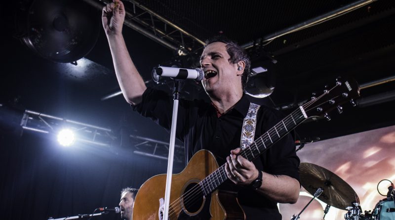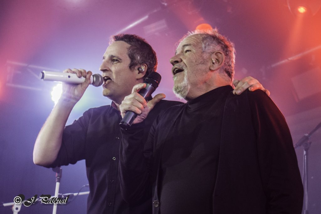 De nuevos los puños en alto acompañaban a «Capitán Veneno» posiblemente el tema más Heavy de la noche, con un gran solo final por parte de Guillermo mientras sus compañeros se tomaban breve y merecido descanso. La emotiva «Calles Inundadas» nos traía a la memoria las vivencias globales de la pasada pandemia, mientras imágenes de telediarios del momento se proyectaban sobre la pantalla trasera. Continuaba la fiesta con el desenfado «Funeral» eso si sin contar con la presencia de Fanfi con sus divertidas performances que por motivos personales no pudo estar con la banda en esta ocasión. Para el siguiente tema «Me Va a Faltar el Aire» estaba prevista la presencia de Xana Lavey, lamentablemente esta no puedo acompañarles, una auténtica pena que seguro que tanto DRY RIVER como Xana, trataran de que ese encuentro sea posible en otra ocasión. Mientras el público asistente suplieron a petición de Ángel a la perfección la ausencia de la cantante de CELTIAN. Ángel nos comenta que para cumplir con los horarios establecidos nos ahorraran el paripé de salir y volver entra mientras guitarra acústica en mano acometían «Peán» en una primera parte interpretada por el en solitario a la voz, pero que tras el punto intermedio de Matías, contaba con la aparición en escena de Isra Ramos, todo un lujo poder escuchar a la vez a estas dos grandes voces sobre el escenario.