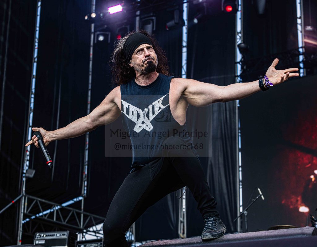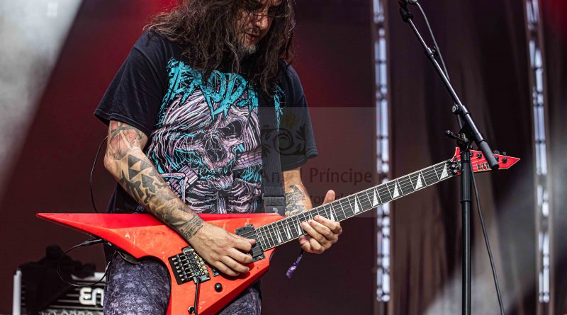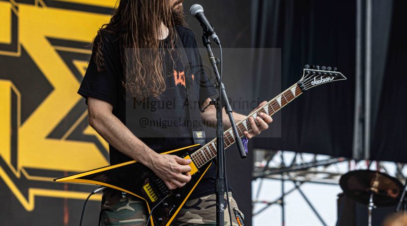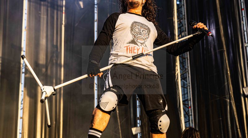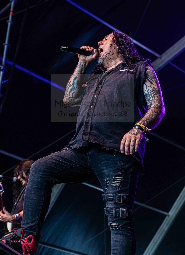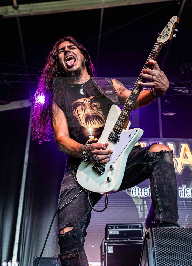 Los ANGELUS APATRIDA siempre tan orgullosos de su tierra albaceteña, se mostraron tan implacables como cercanos en el desarrollo de un Set List perfecto técnicamente hablando con demoledora batería y riffs afilados junto con la siempre inconfundible garganta de Guillermo Izquierdo plantando cara a los más afamados como «Indoctrinate», tema para el cual ya habían llegado los primeros pogos alcanzándose hasta tres en activo para dar calor a las grandes del Thrash «Sharpen The Guillotine» o «Give ‘Em War» cerrando la banda con una incontestable «You Are Next» para dejar patente que lo suyo, no es por casualidad.