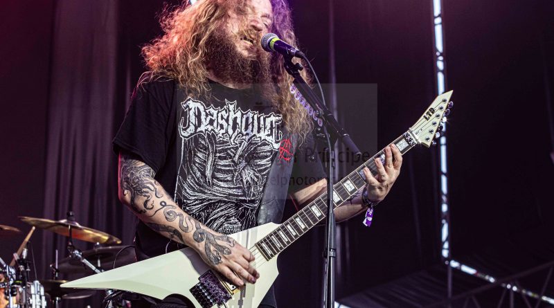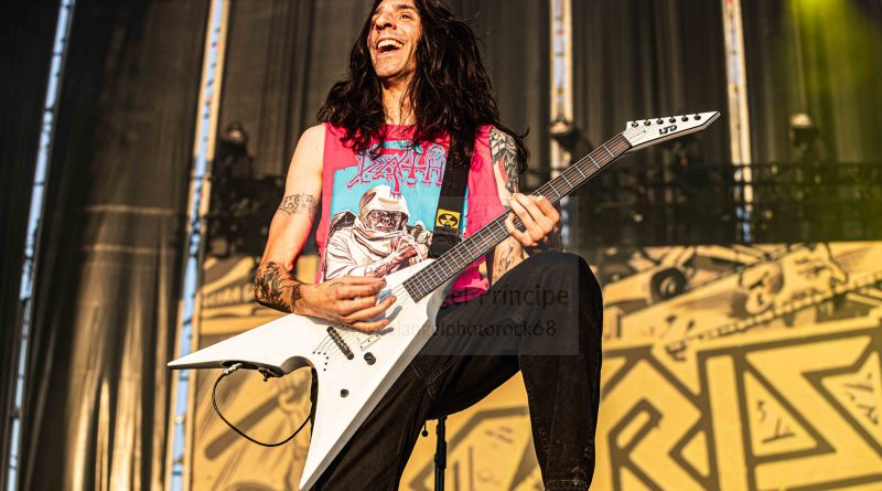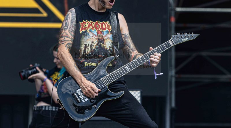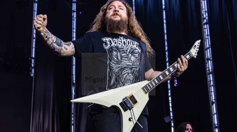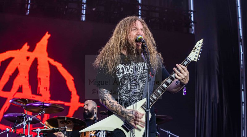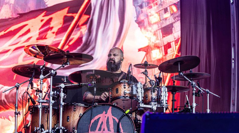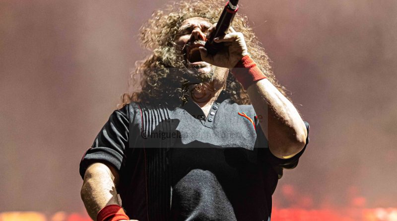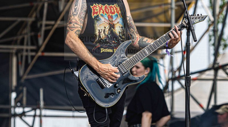 Los ANGELUS APATRIDA siempre tan orgullosos de su tierra albaceteña, se mostraron tan implacables como cercanos en el desarrollo de un Set List perfecto técnicamente hablando con demoledora batería y riffs afilados junto con la siempre inconfundible garganta de Guillermo Izquierdo plantando cara a los más afamados como «Indoctrinate», tema para el cual ya habían llegado los primeros pogos alcanzándose hasta tres en activo para dar calor a las grandes del Thrash «Sharpen The Guillotine» o «Give ‘Em War» cerrando la banda con una incontestable «You Are Next» para dejar patente que lo suyo, no es por casualidad.