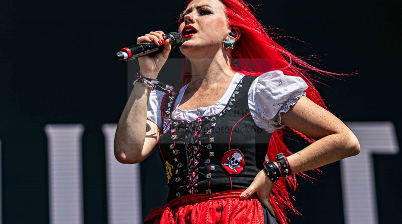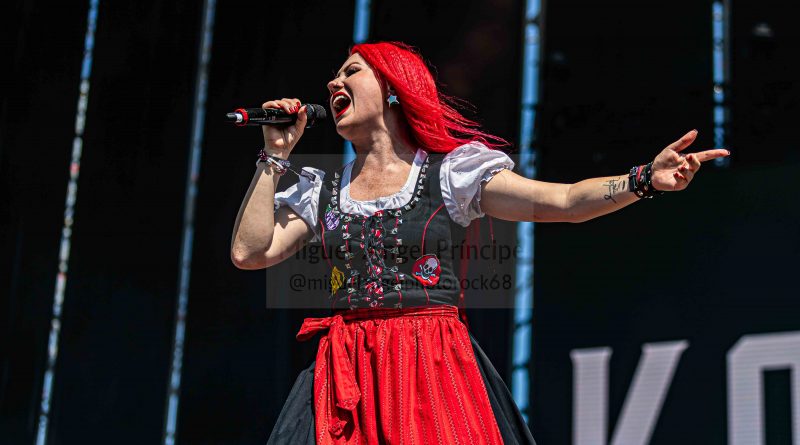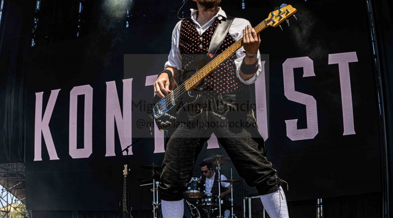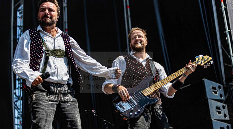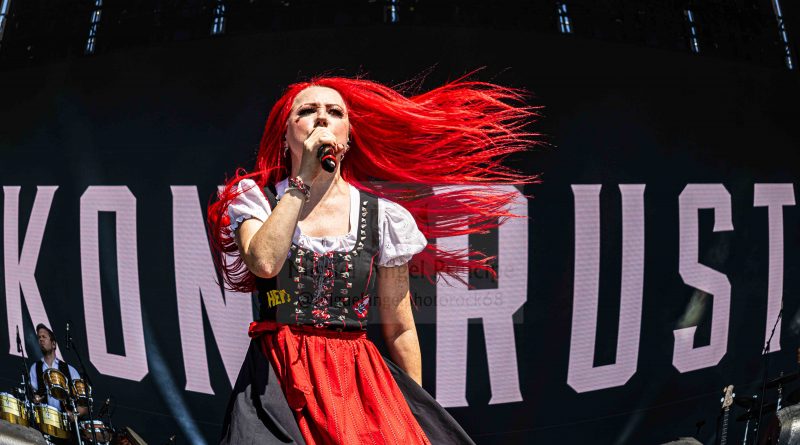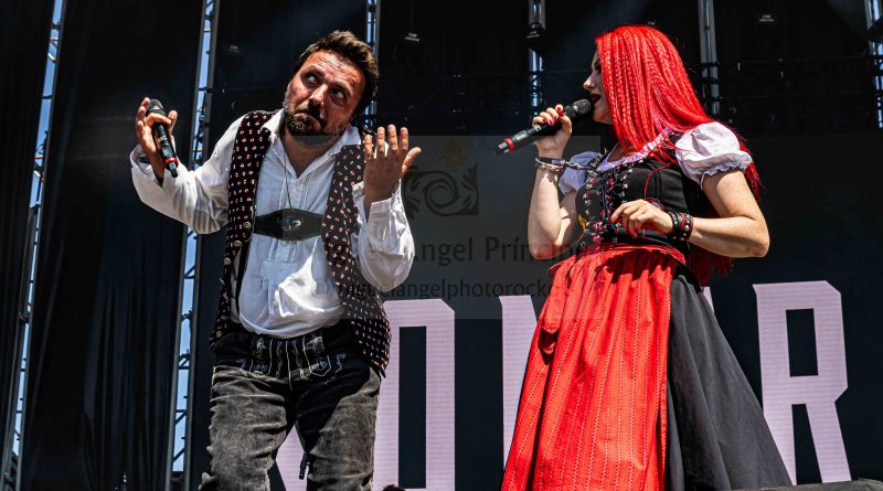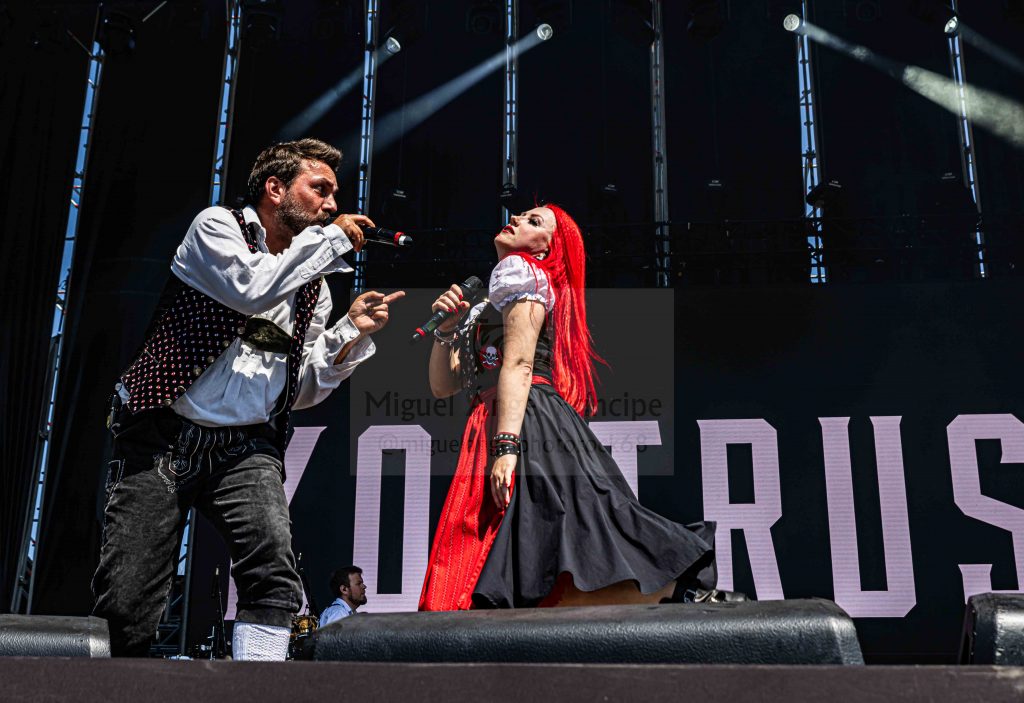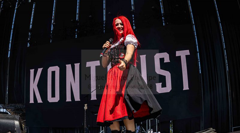 KONRTRUST hizo los honores a su origen austríaco saliendo los componentes con el atrezzo completo del traje típico del país para enzarzarse en su peculiar Party Metal muy dinámico al contar para su gestión con dos vocalistas chica y chico, dos entregadas voces que sacaron adelante temas y show de imparable ritmo sobre el escenario creando un ambiente totalmente festivo que movió a la gente en una apuesta de inquietante Crossover musical con elementos tradicionales unidos al Metal para exitosas canciones como la pegadiza «Hey DJ» o «Bomba».