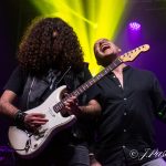 El locutor, José Luis Martínez, subía al escenario para presentar a los dos siguientes invitados dos ex miembros de COZ que unían sus guitarras a las de Dani y Miguel, Eduardo Pinilla y Tony de Juan, y que junto a Ana Sánchez al saxo y el resto de la banda, serian los encargados de interpretar «Imagínate» un fabuloso tema escrito en 1981 tras la muerte de John Lennon, en el que las cuatro guitarras fueron alternándose para deleitarnos con las notas salidas de sus instrumentos. Tanto la nómina de invitados, como el repertorio aún no estaban al completo, faltaba incorporar una voz femenina encarnada por Bárbara Black, que reivindicaba el día de la mujer para presentar el tema imprescindible en todo concierto de COZ, «Las Chicas Son Guerreras» para el que se mantenían sobre el escenario tanto Pinilla, Tony y Ana, en lo que parecía un fin de celebración, con el público animado por Bárbara a cantar junto a la banda. Pero aún teníamos un poco más de cuerda, para acabar la noche ya en el tiempo de los bises con una par de temas, la ampliamente versionada «Route 66» de Bobby Troup, y «Rock me, baby» de BB King, que marcaba el punto y final definitivo, de lo que fue una gran fiesta a la que aún había que sumar la posibilidad de charlar con algunos de los protagonistas que no tardarían en unirse al público de la sala charlando y fotografiándose con unos y otros.