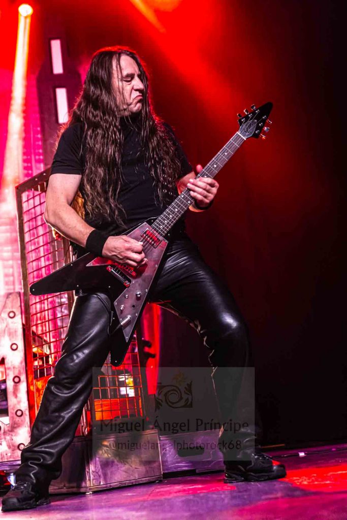 Mark Tornillo a la voz y Wolf Hoffmann a la guitarra se echaron a las espaldas un directo pasional y de alto voltaje en el que también estuvieron muy presentes sus compañeros de viaje enjaezados con cuero, cadenas y tachas funcionando en perfecto combo todos a una para dejar su impronta no sólo poniendo de largo el reciente trabajo Humanoid, sino desplegando en alfombra roja una serie de clásicos para dar forma a un acertado repertorio tanto de actuales como de himnos que la feligresía ovaciono a rabiar comenzando ya de entrada por «The Reckoning», enmarcado éste en haces de luces que favorecieron el arrollador Heavy Metal que el grupo gestionó de forma inmisericorde sobre las cabezas de todos nosotros.