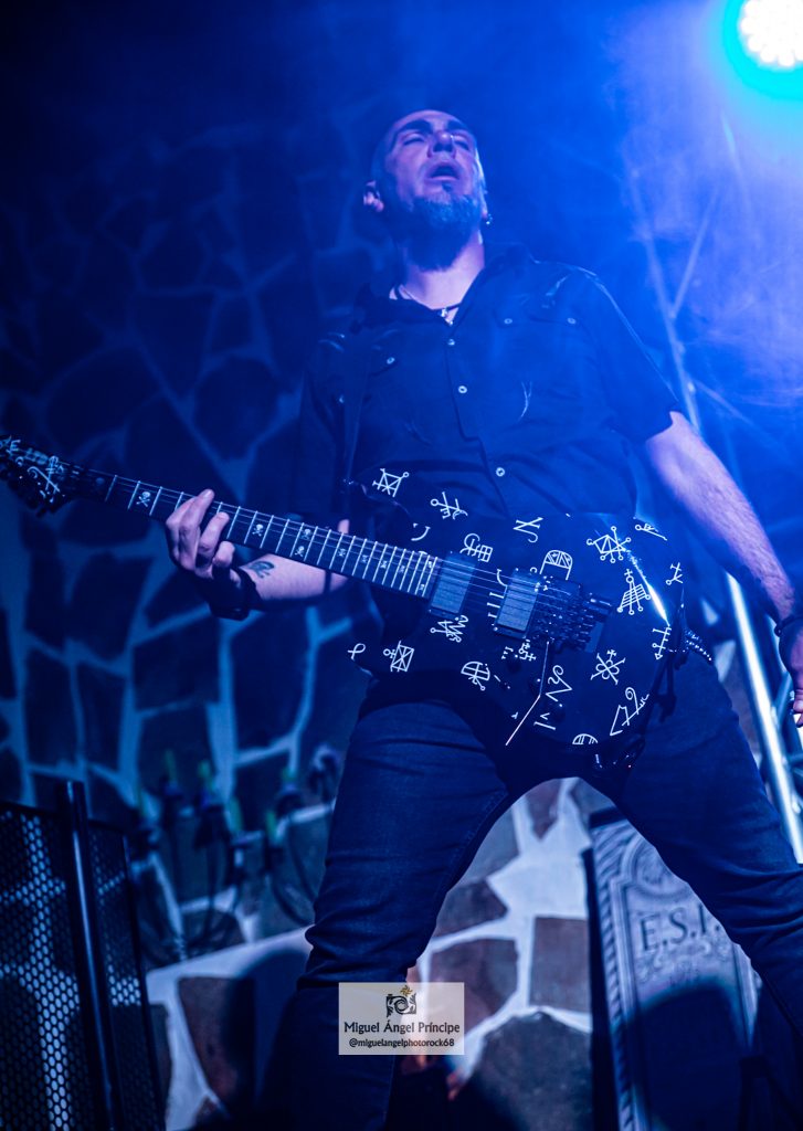 La noche se abrió con una Intro que ya preparó a los asistentes para lo mejor, poniendo sobre las tablas a la banda y constituyendo una obertura perfecta para arrancar sin más preámbulos con «Fanáticos Del Terror», tema que se erige como un canto en contra de las idolatrías impuestas y lo hace con ferocidad e inmerso en una composición musical de gran pisada y con marcada importancia en ciertos cambios de ritmo muy interesantes, giros que suponen un juego musical en la canción muy bien gestionados por la voz de Víctor quien cuenta con un amplio registro que se pasea sin mayor problema por los agudos perfectamente acompañado por un guitarreo persistente de poderosas distorsiones abriendo el tema y que mantendrá su presencia a lo largo del mismo, otorgando a éste una poderosa melodía salpicada de guiños hacia notas cercanas al Rock Andaluz matizadas por los baquetazos de Juanma, unos parches muy presentes durante toda la actuación como también quedó patente en la siguiente «Junto A La Orilla» de exquisito punteo a cargo de Fariña para este tema de letra dura que habla sobre la emigración y al que los coros otorgaron cierto cariz épico a la vez que dramático.