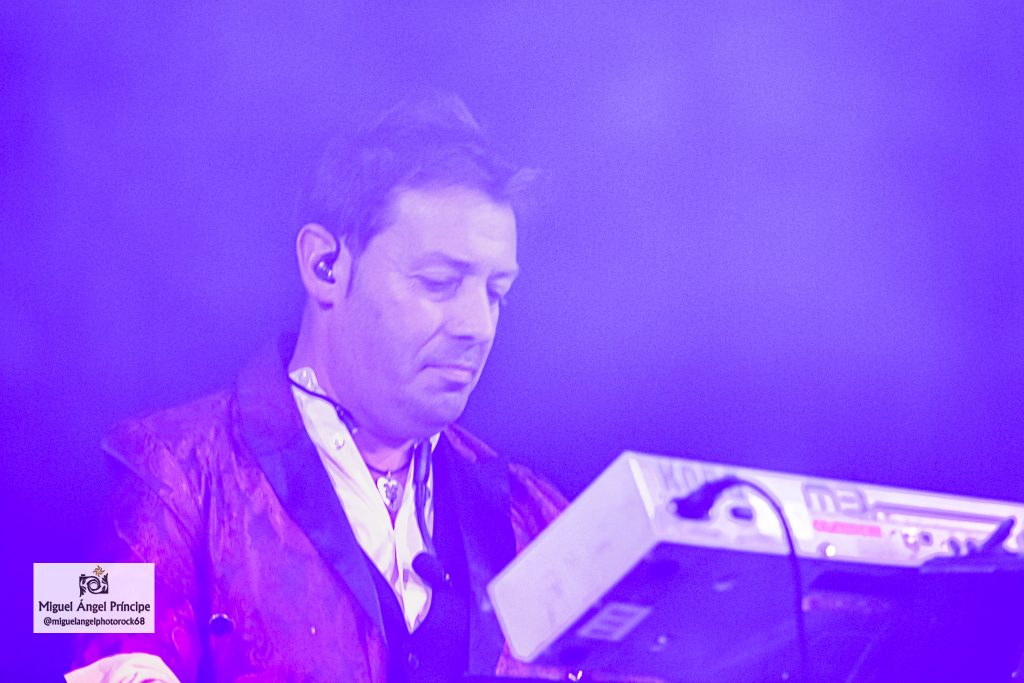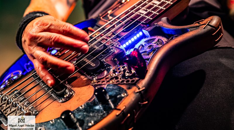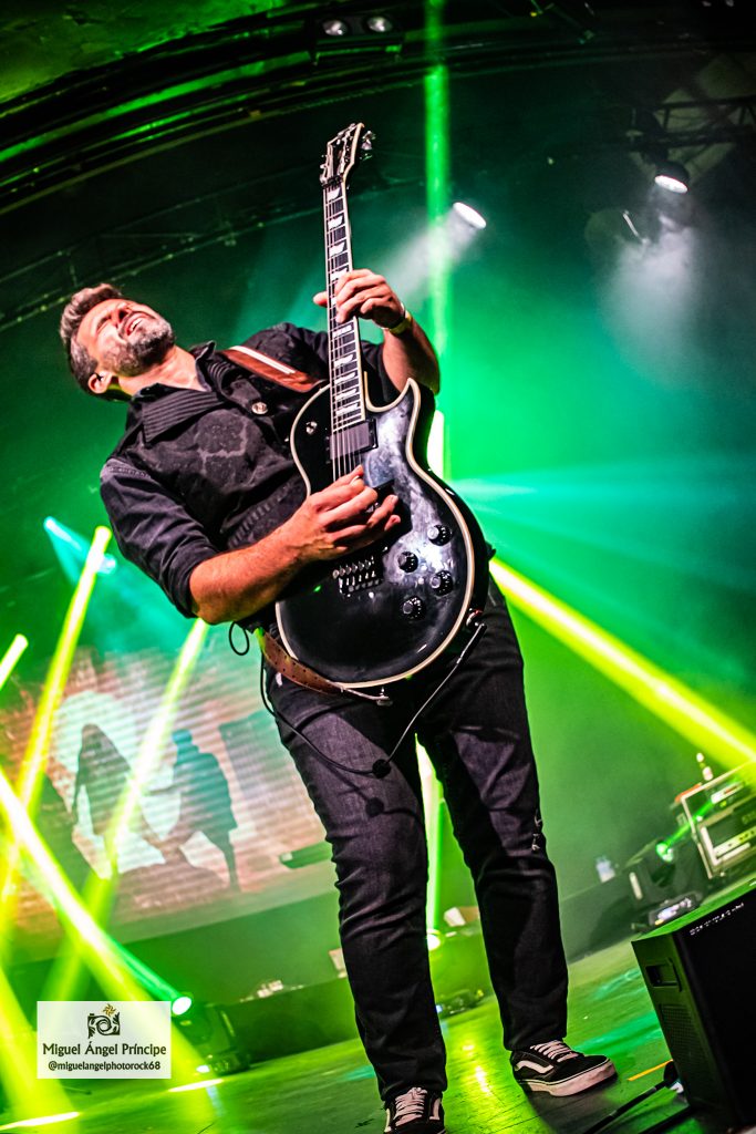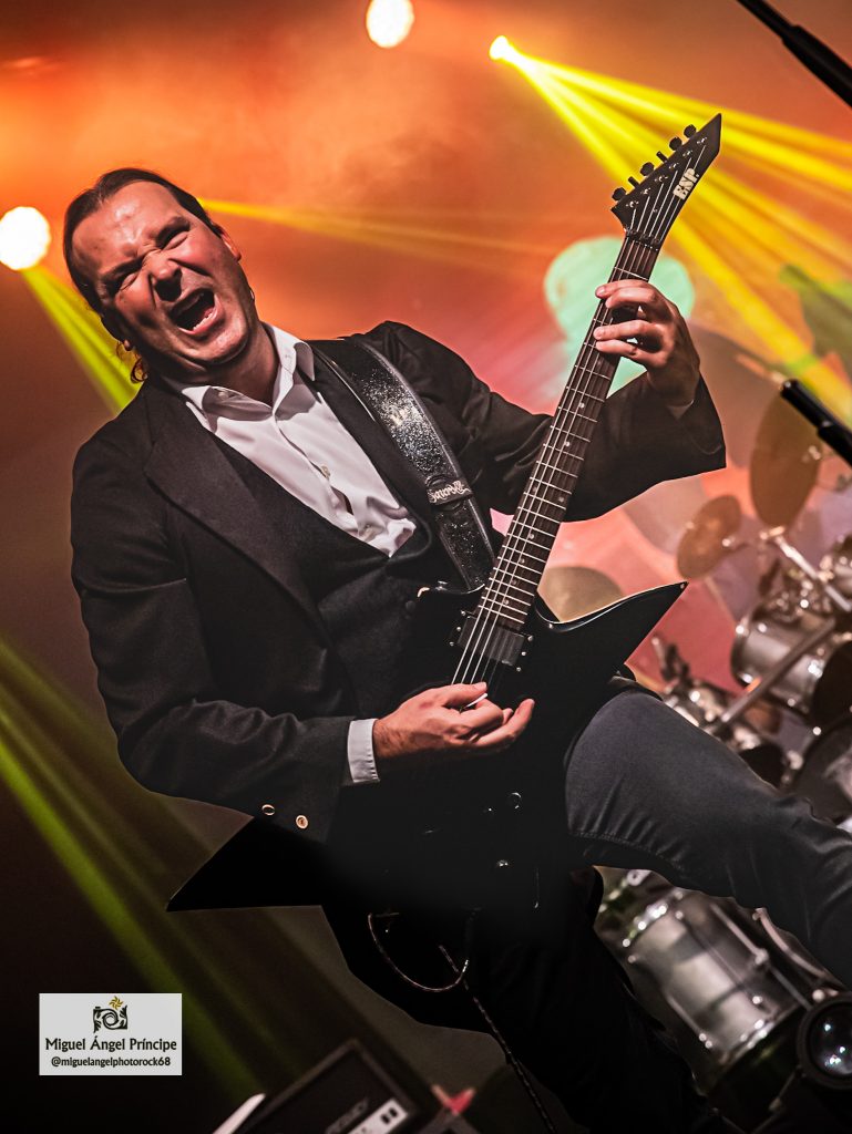 Uno de los momentos álgidos de la noche llegó con «¡Vive!» y «Salta», dos imprescindibles que trajeron una nueva batería de efectos que eclosionaron delante de los músicos para engrandecer estas composiciones muy ricas en notas, cargadas de buen gusto y perfectamente gestionadas por ambas seis cuerdas, ya que tanto Narci como Raúl Rueda deslizaron con rapidez y virtuosismo sus dedos por unos mástiles que en el caso del segundo desembocaron continuamente en riffs marcados y deliciosos perfectamente acompañados por la rítmica a cargo de Lara, quien en varias ocasiones alentó desde su posición al respetable para que agitara las manos en otras como «Soñando Contigo» o «3,2,1 … ¡La Tierra!» con un significado ésta muy especial para Miguel Ángel, pues según dijo el vocalista la letra tenía un fondo que iba más allá de lo que el título podía sugerir, una interpretación para la cual se ayudó por una exquisita guitarra acústica gestionada por él y tras cuya interpretación dejaron a todos boquiabiertos con la acariciadora «Cuando Nadie Nos Ve».