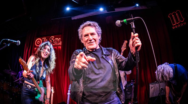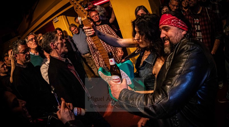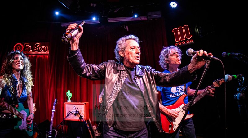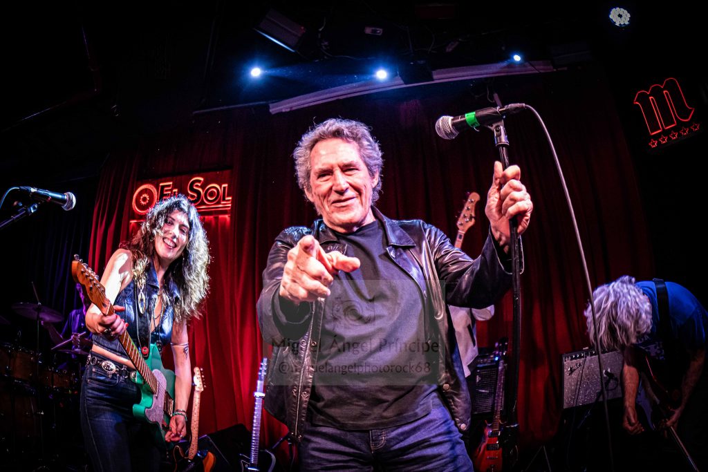 Con una presentación de lujo donde quedó reflejada tanto la admiración como el cariño de Susan Santos por él y con anécdota incluida, saltó al escenario el primer invitado de la velada José Nortes de los Black Betty Studios donde fue grabado el Sonora marcándose junto al trío protagonista una brutal interpretación del «What I Want», colaborando Nortes a los coros tanto con David como con Juli y a las seis cuerdas con una Santos que retomó su guitara aguamarina para arrancar los mejores acordes a este tema recién horneado de estribillo pegadizo, riffeo pertinaz, cadencia recordable y ritmo bailable que caló en un público que por momentos y sin dejarlo acabar, se arrancaba en aplausos sobre todo cuando los punteos de Susan ocupaban el espacio de esta canción distendida y muy rítmica a la cual José aportó viveza y riqueza a partes iguales, precediendo éste con honores al que sería el siguiente invitado de excepción de la noche recibido con calor tanto por parte del grupo como por parte del respetable que se entregó en cuerpo y alma a un Miguel Ríos más rockero que nunca enjaezado con «chupa» de cuero para marcarse a dúo ese «Cosas Que Le Debo A Madrid», una imprescindible que vio la luz en sus manos allá por el año 2004 como toda una declaración de intenciones que este «granaíno de pro» compuso para la ciudad de la que es un honroso hijo adoptivo gestionando este Rock And Roll festivo con esa maestría que siempre ha demostrado sobre el escenario y ahora en tándem perfecto con la pacense, convirtiéndose este ecuador del show en uno de los momentos álgidos cerrado por una imparable tanda de aplausos.