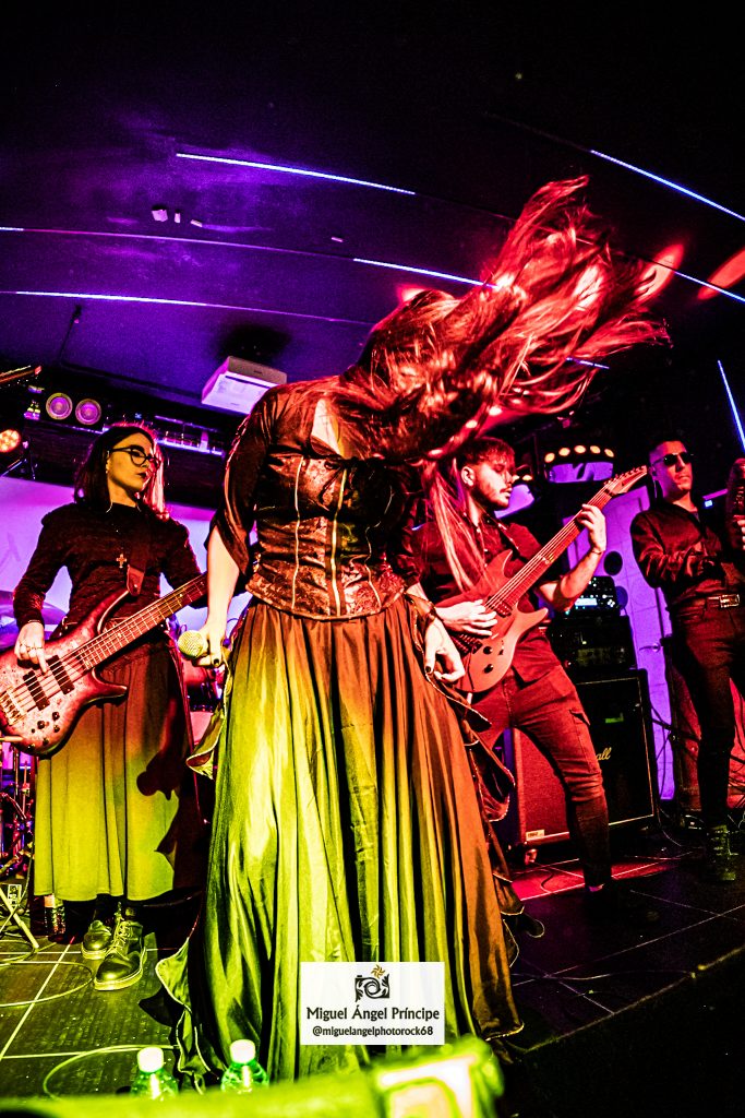 El show lo abría XHAMAIN bajo una luminaria de potente rojo sobre sus cabezas, gestionándose así una atmósfera intensa que el sexteto supo aprovechar como potenciador de su imagen, una estética muy marcada por una performance gótica que puso en ambiente al personal comenzando con «Insomnio» y «Tempo Atrás», dos temas que comenzaron a marcar una descarga de sólidas notas mezclándose Power, Death y Folk con letras en gallego ejecutadas gracias a una extraordinaria modulación vocal por parte de la cantante Mariah, a quien percibimos muy cómoda sobre la escena arrastrando en esta seguridad al resto del grupo que no escatimó en carisma y trallazos contundentes fortalecidos por unas muy bien combinadas percusiones, siendo el bajo un elemento fundamental y foco de atención al contar con la nueva incorporación de Carmela Wharhol ya totalmente integrada ya en la banda.