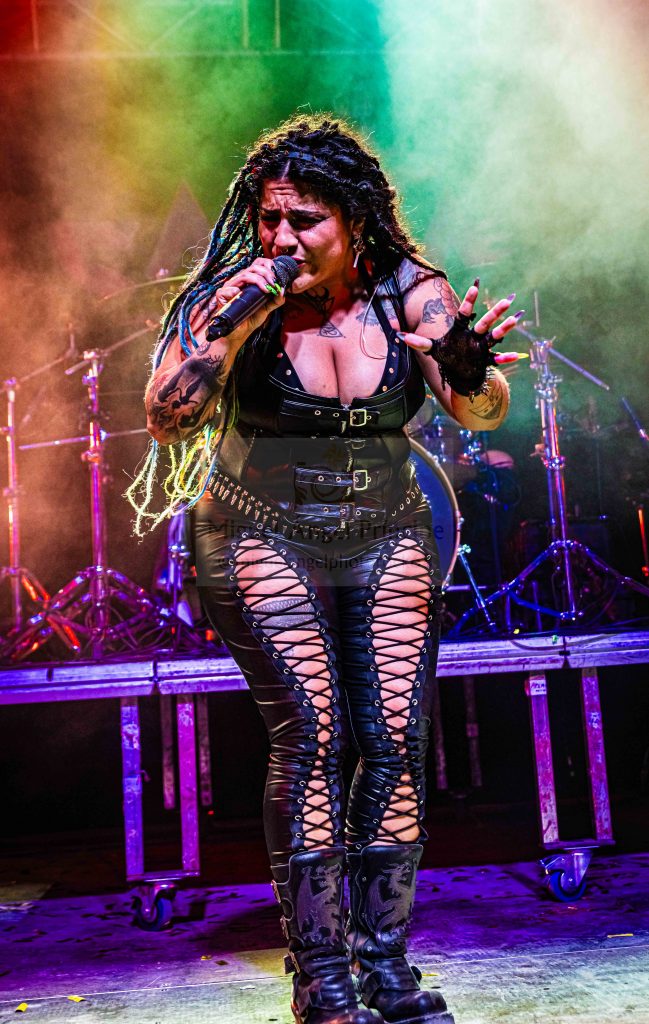 La memoria y los sentimientos se empezaron a reactivar cuando revivimos principalmente y de manera salvaje los discos Reencarnación y No Hay Piedad Para Los Condenados a través de la voz generosa, imbatible, abigarrada y cargada de fuerza de Eva, quien perfectamente arropada por las contundentes bases rítmicas con un sonido más despiadado que nunca y por los teclados literalmente embaucadores, se despacho cuero de por medio con «Fuera En La Calle», «No Eres Suficiente» o «Héroes De Papel» que cuernos en alto y cantándolas al completo la gente aplaudió a rabiar.