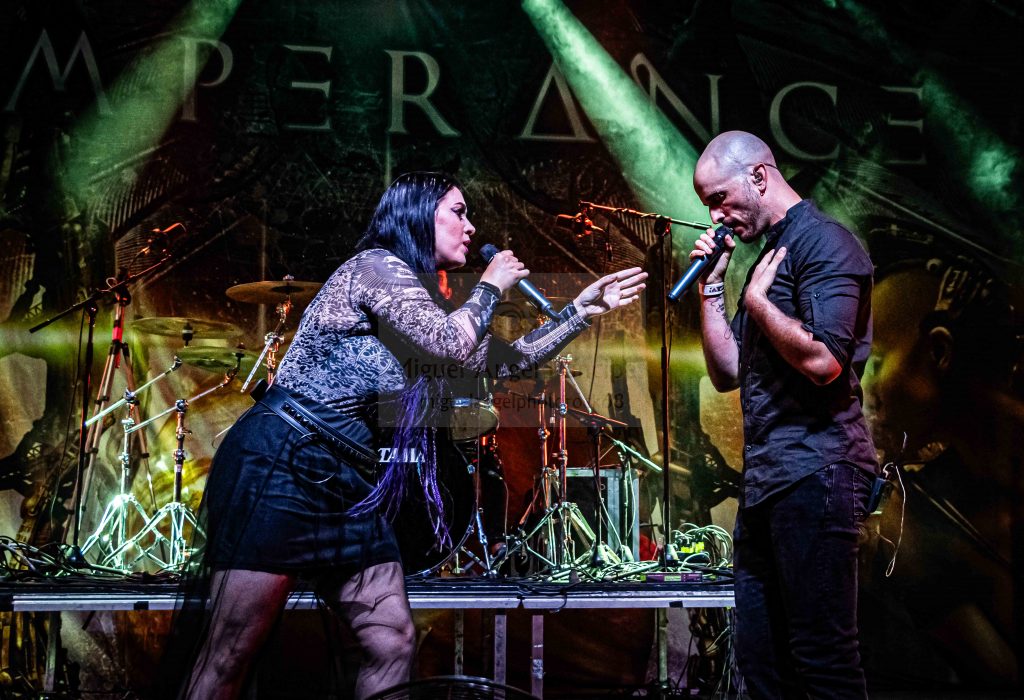 TEMPERANCE desde Italia hizo acto de presencia en el New Rock guiado por sus vocalistas Michele Guatoli y Kristin Starkey que siempre ofrecen una ágil versatilidad sobre el escenario a la banda, aportando ambos con sus gargantas unos constantes cambios de ritmo en la dinámica de la actuación para otorgar a la misma una gran viveza completada ésta por Marco Pastorino a la guitarra, un seis cuerdas muy activo también a la voz que no paró de jalear a la gente completándose el combo con Luca Negro al bajo y Marco Sacchetto a la batería.
