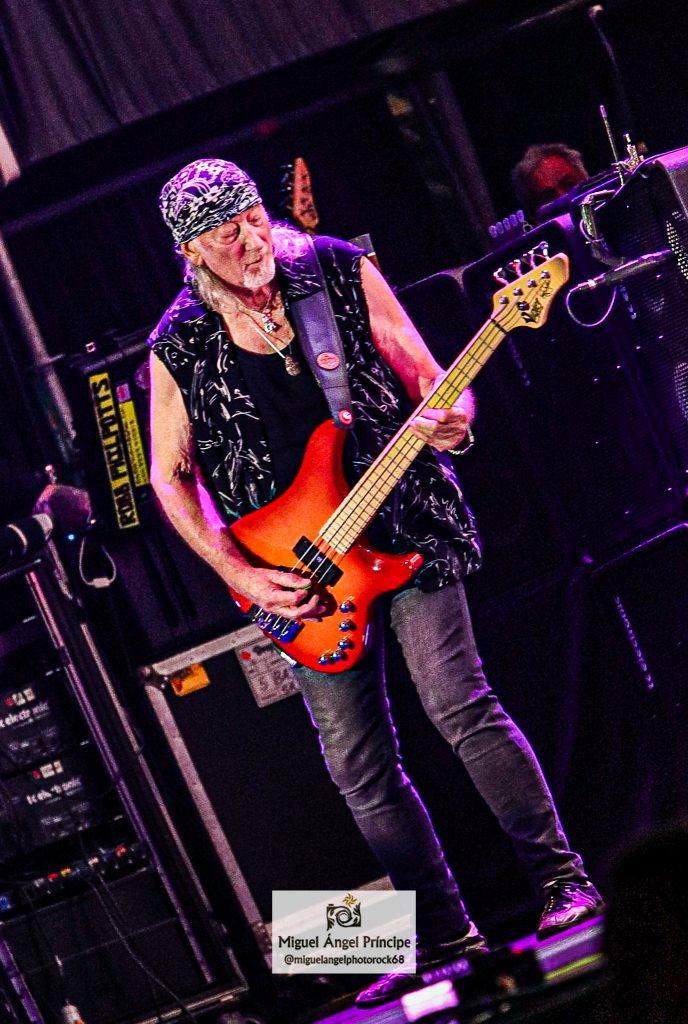 Hemos de señalar que dentro de lo que fue el directo, sin duda el más activo de los míticos dinosaurios fue Roger Glover que no paró de sonreír, acercarse al filo del escenario y moverse a un lado y a otro en especial química con el guitarrista de la banda, un Simon McBride que nos pareció jovencísimo al lado de nuestros queridos y míticos ídolos aún liderados por un Gillan que apareció de forma sencilla recibiendo la ovación de todo el mundo y respondiendo a ella con el arranque de «Highway Star» a la que por supuesto siguieron las más queridas que deseábamos escuchar todos como «Hush», «Smoke On The Water» que marcó uno de los momentos álgidos del concierto junto con la juguetona «Black Night» u otro legado como «Into The Fire» mientras detrás de ellos en una pantalla gigante, los símbolos más puros de esa psicodelia que empapa a los británicos desde sus inicios y que sigue marcando su ADN acompañaba a los músicos bajo unos precisos focos que se fueron centrando en cada uno según lo requería la actuación.