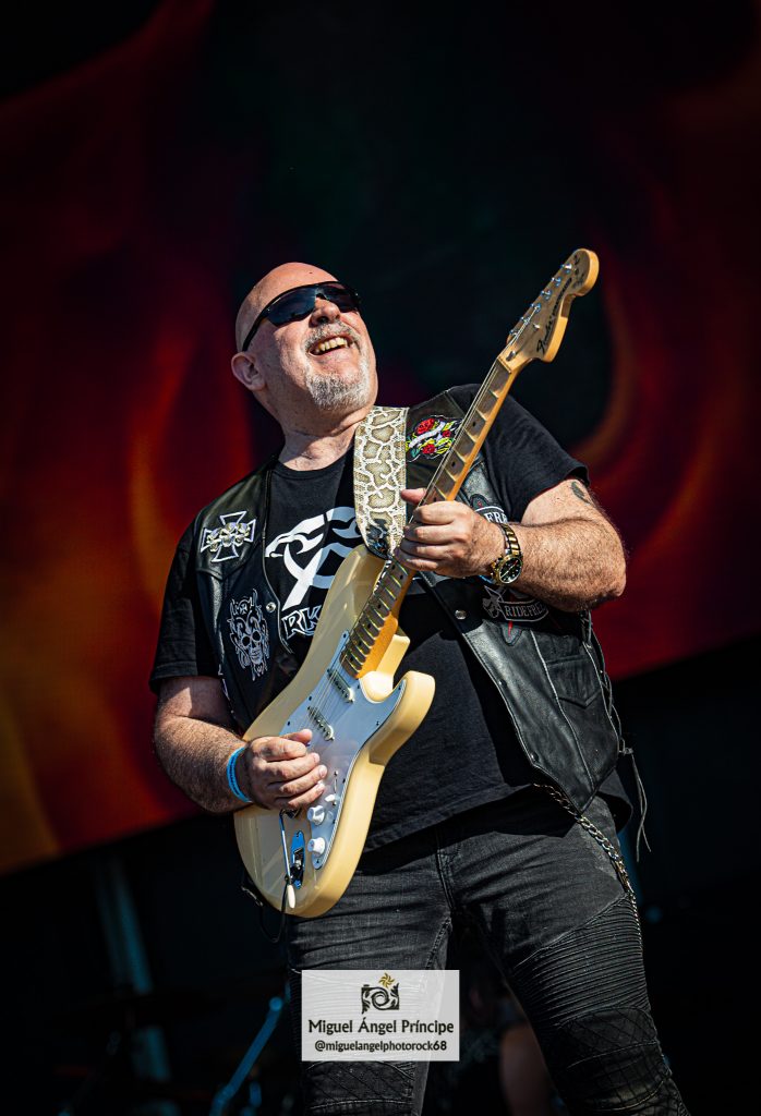 Mientras abajo los de Ronnie Romero de nombre ELEGANT WEAPONS, se hacían con un público expectante y nutrido dando toda una lección de Heavy Metal elegante que nos atrapó de principio a fin gracias a este súper-grupo de reciente creación y con disco editado en 2023 titulado Horns For A Halo, el cual incluye sin prejuicios ni dificultad un exquisito y trabajado Metal Clásico aliñado con un Hard en ocasiones misterioso pero siempre rematado por la luminosidad que elevados músicos de la talla del guitarrista Richie Faulkner (JUDAS PRIEST), el batería Christopher Williams (ACCEPT) o el bajista Dave Rimmer (URIAH HEEP) se encargan de plasmar sin esfuerzo acompañados por un Romero de garganta privilegiada que se manifestó compacto, exultante, entregado y encantado de volver a nuestro país para hacer historia al entrar en plena comunión con unos expectantes fans que a las 17:25 horas comenzaron a disfrutar con canciones propias como «Do Or Die», «Blind Leading The Blind» y «Dirty Pig» o impagables versiones como el «Lights Out» de los eternos UFO, apoteósica ésta con el respetable cantando a pleno pulmón cuernos el alto o un vacilón «War Pigs» de los SABBATH, despidiéndose la banda con los más grandes honores, ovaciones y aplausos del Cartagena Stage.