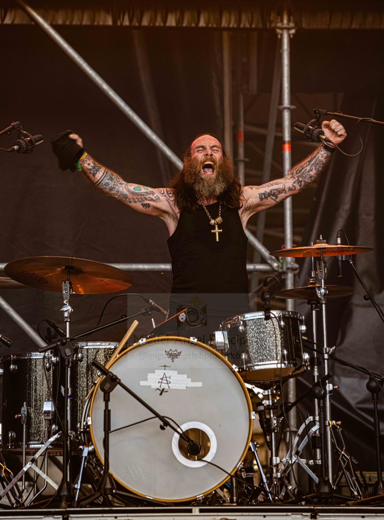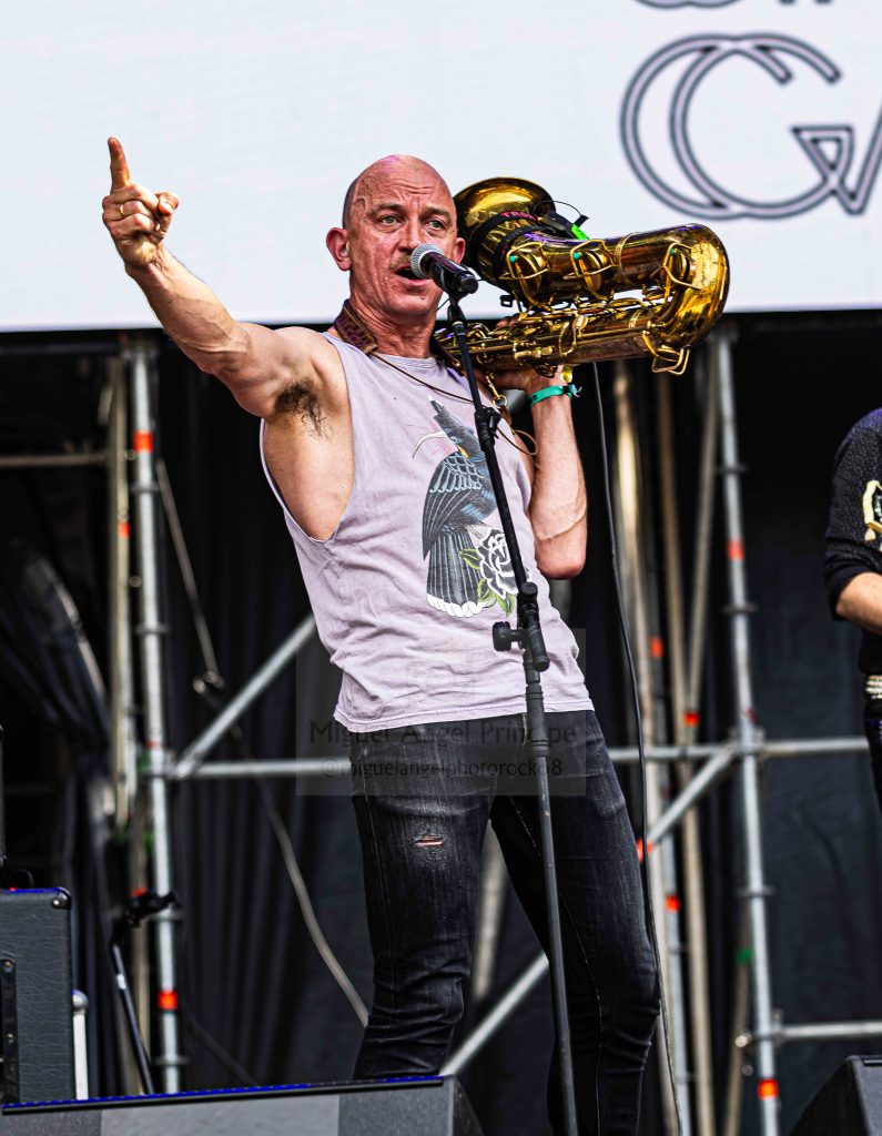 Nuestra segunda apuesta llegó con SPIDERGAWD en el Estrella Levante Stage llegados desde Noruega para ofrecernos un Hard Rock rompedor presentado en formato quinteto con mención especial al saxofonista, un virtuoso erigido en el líder de la banda en cuanto a actitud se refiere a los mandos de un instrumento de viento de casi gigantes proporciones con el que además de aportar una excelente base rítmica a los temas, gestionó una puesta en escena activa sin parar de moverse de un lado a otro alentando a la gente para que levantase las manos y en definitiva se involucrase en un espectáculo que en algunos tramos adquirió tintes psicodélicos.