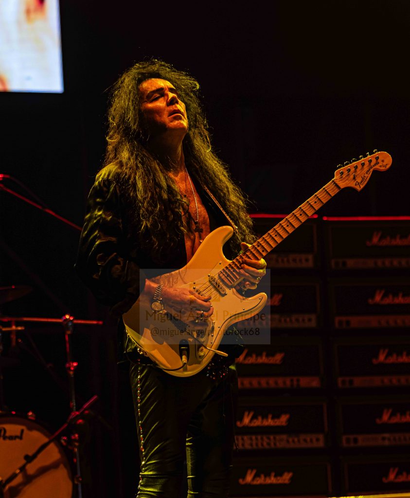 YNGWIE MALMSTEEN el talentoso, un guitarrista de incalculable valor y valía musical que despierta al mismo nivel tanto filias como fobias entre los metaleros aunque lo que no creemos sea discutible, es su calidad a las seis cuerdas aderezada por su imponente figura y en este caso por un muy acertado juego de luces y humo para entretejer su silueta a veces sinuosa entre sombras, una magistral puesta en escena para arrancar el directo con «Rising Force» interpretada vocalmente por el teclista.