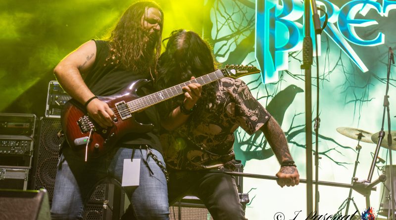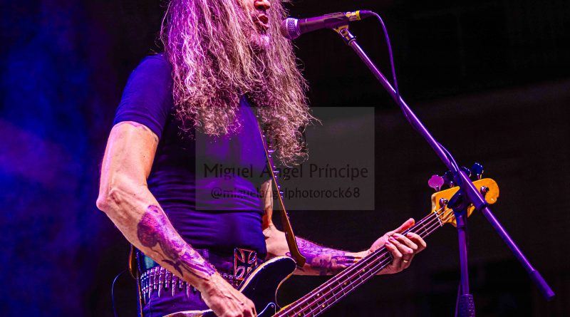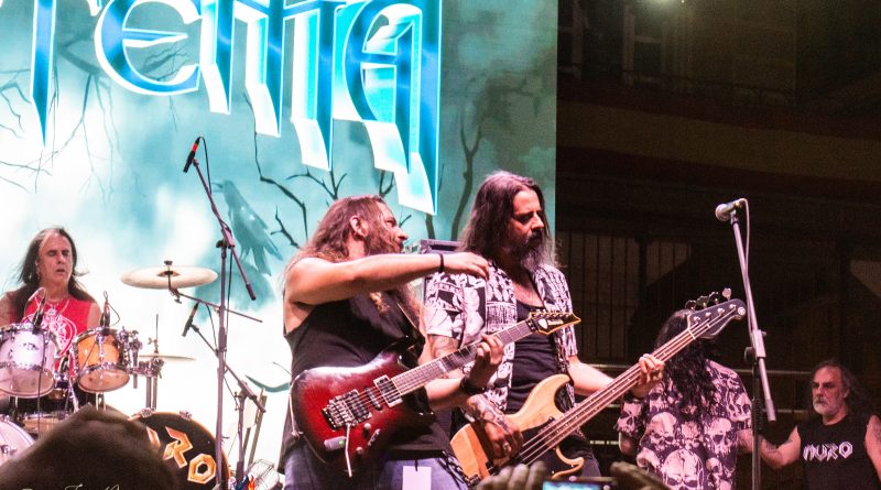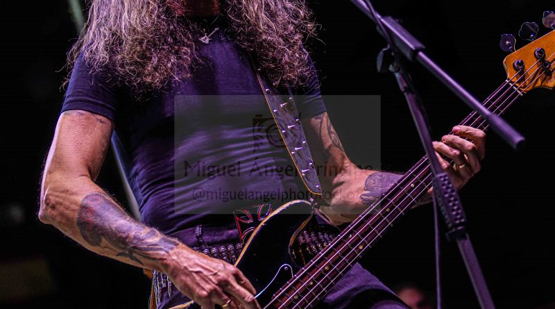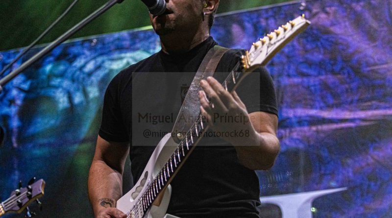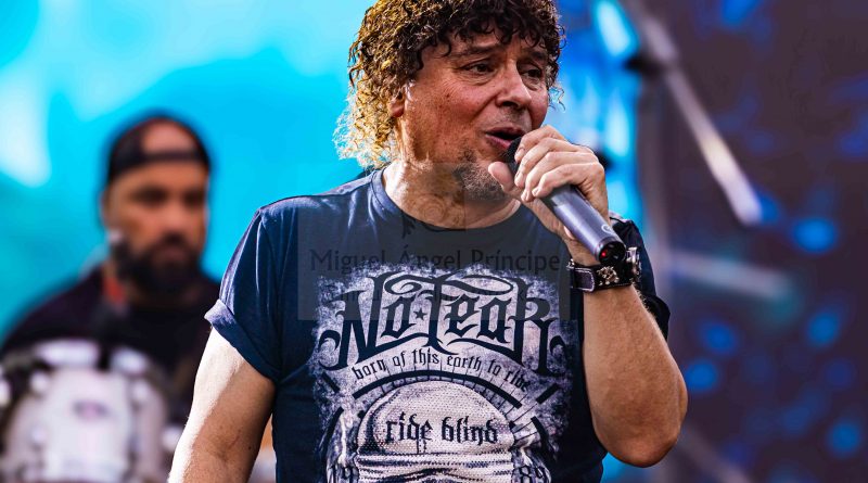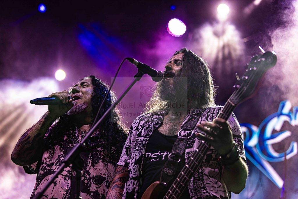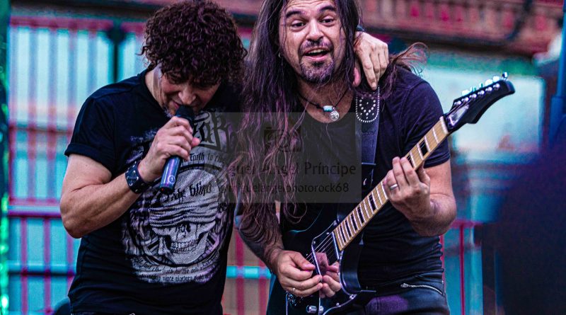Tras el preceptivo y veloz cambio de equipo, llegaba el turno a otra banda de reciente creación, pero al igual que sus antecesores formada por un elenco de músicos de sobrada experiencia, hablamos de BRÉTEMA, en la que nos encontramos a la voz a Pancho Brea, Robert Brade a la guitarra, Juanjo Cobacho al bajo u Joaquín Arellano (El niño) a la batería, acompañados en esta ocasión por Víctor Conde a la guitarra en sustitución del otro guitarra titular de la banda José Rubio. Arrancaban con «Oscura Luz» el tema que abre su hasta ahora único trabajo, para atraparnos ya desde ese primer momento en un universo de solos y riff de guitarra perfectamente fusionados con la voz de Pancho y con una potente base rítmica, receta perfecta para hacer vibrar a una plaza entregada que tan pronto descargaba adrenalina con temas como «Tiempo» o «Perdida en el Ayer» en el que Pacho se hizo acompañar por las palmas de todos los presentes, o acompañaba el estribillo de una deliciosa balada como es «Decirte adiós». Notable actuación sin duda la de BRÉTEMA la que nos dejó en esta su segunda actuación en directo desde su formación que cerraba con una versión de SANGRE AZUL «Tal Como Soy».