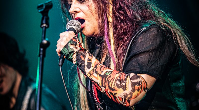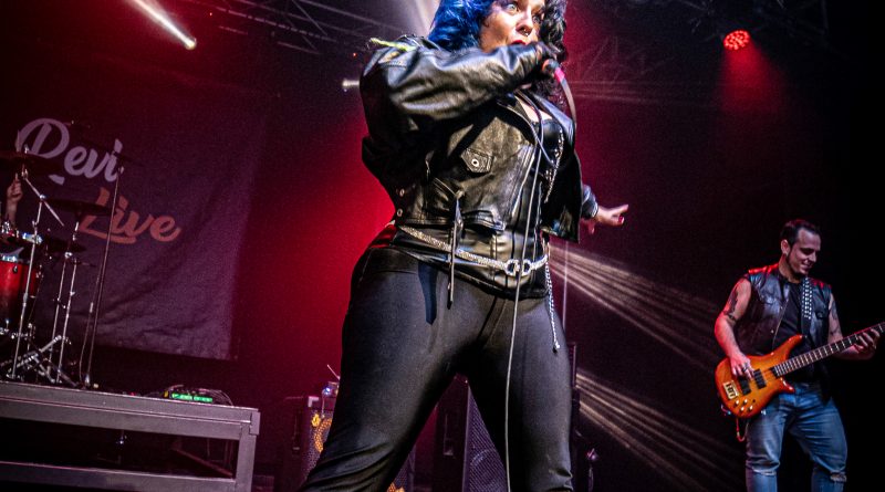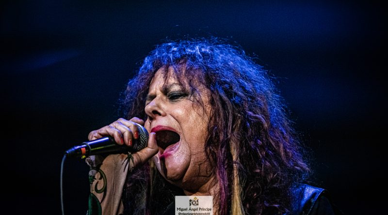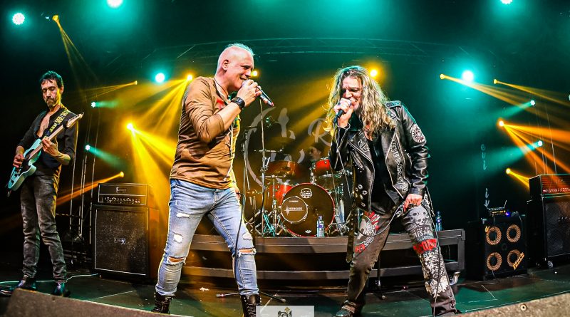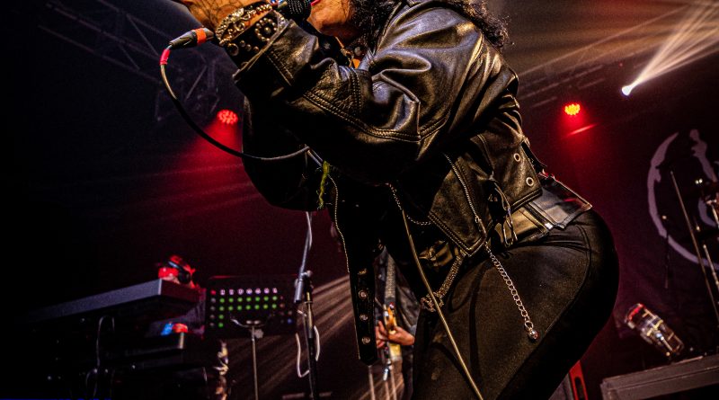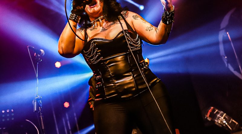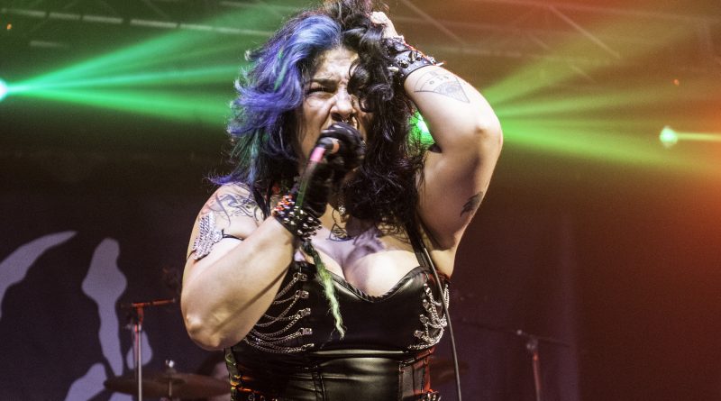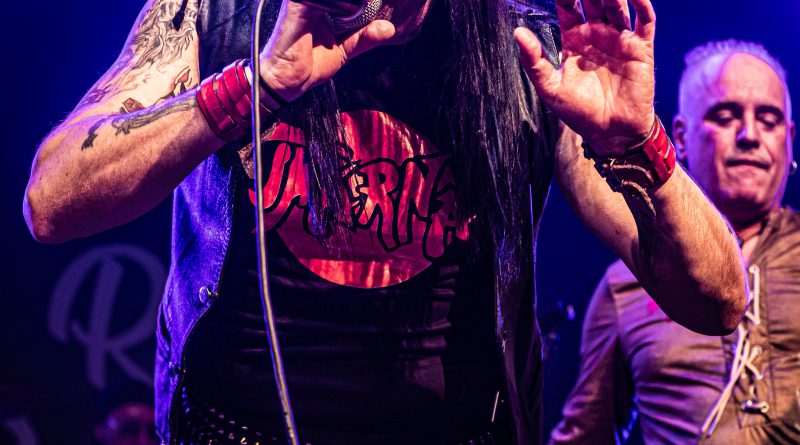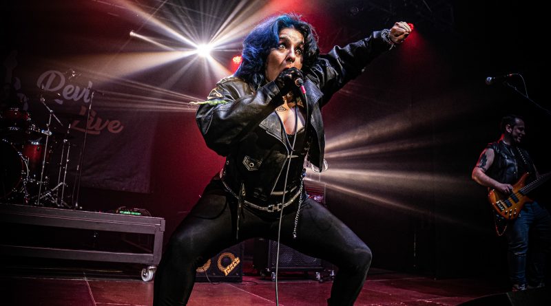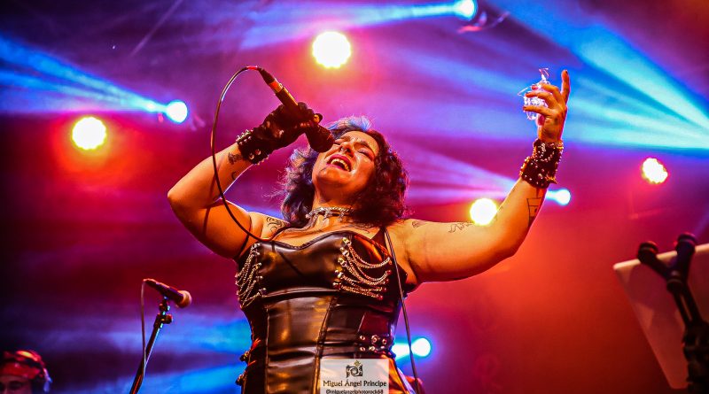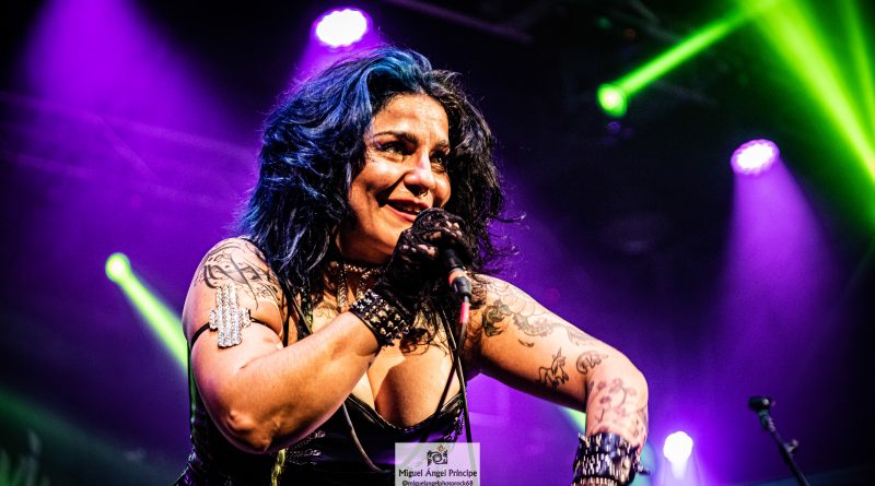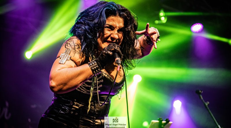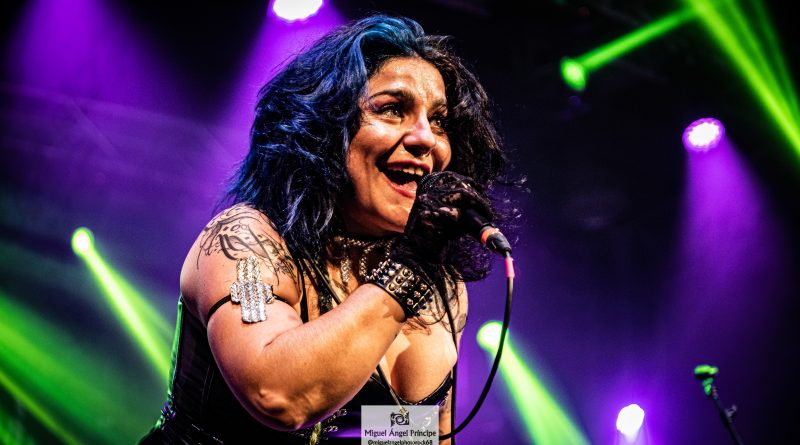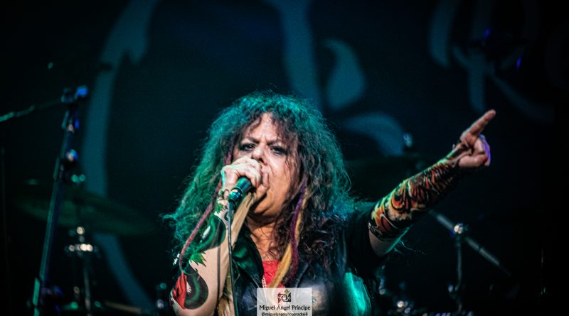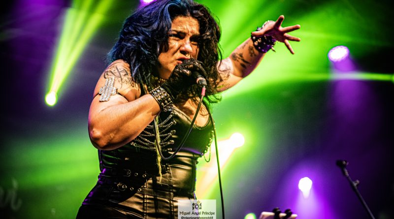 Por fin llegaba el momento en el que la luces se apagaban y entraban en escena SATAN, con un comienzo lleno de fuerza con Eva García, su vocalista blandiendo un látigo y entonando las primeras estrofas de «Desertor» con las que se me pusieron los pelos de punta, por que el enorme parecido de la voz de Eva con la de Azucena, me transportó durante unos momentos a muchos años atrás, en una de las múltiples ocasiones en las que tuve la fortuna de ver a SANTA en directo. sensación que se vio confirmada mientras sonaban temas como «Cuestión de honor», «Héroe de papel» o «Huérfanos de la tormenta» en las que no solo, pudimos comprobar las similitudes vocales, si no su carisma como front woman, todo ello acompañado por una banda solvente y potente formada por Robert al bajo, Ortega a la batería, un Rodri oculto tras sus teclados y un extraordinario Juan Diego a la guitarra.