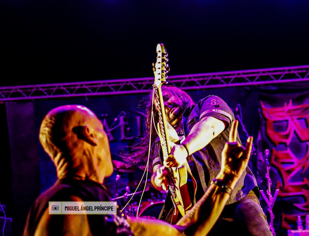Con la colaboración en algún tema de José Ángel Díaz (Piruli), cantante de AZRAEL, se desataron como inicio con toda la rabia que despliega ese «No», tema con el que ya comenzaron a poner las manos de la gente en alto que coreó éste y prácticamente el resto acompañando a la voz de Manuel, quien demostró estar en su mejor momento con agudos soberbios mezclados a la perfección con coros metaleros que avanzaron por «Destino» seguida de «La Muerte Sobre Un Papel», la cual trajo una potente carga de emotividad al recinto ya no sólo por tener una melodía más acogedora, sino por ser una canción icónica de su primer trabajo con la nostalgia que el retroceder en el tiempo conlleva y con la que nos llevaron a un baño de punteos gracias a la forma en la que ambos guitarristas tienen de complementarse en los papeles de rítmica y principal, apostillados por una batería contundente que el bajo matizó con toques medidos buscando en todo momento un perfecto redondeo.