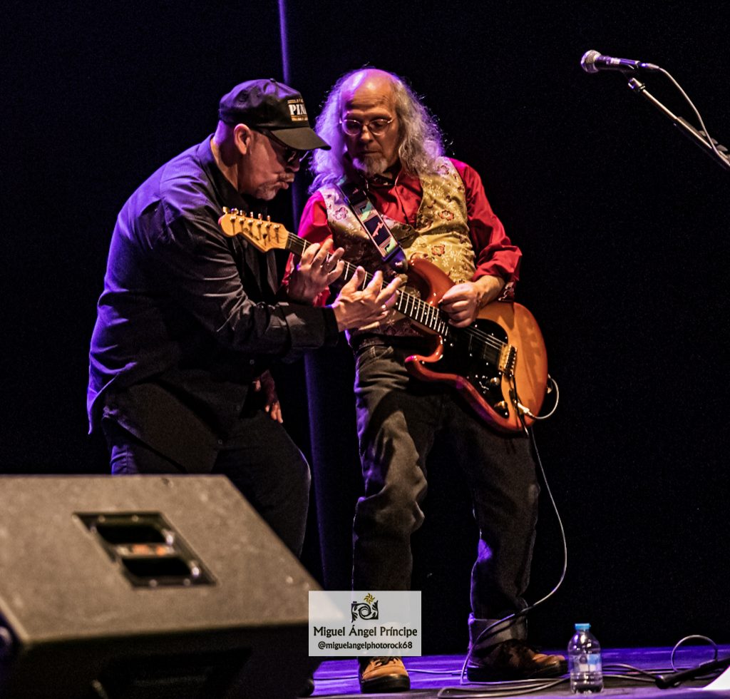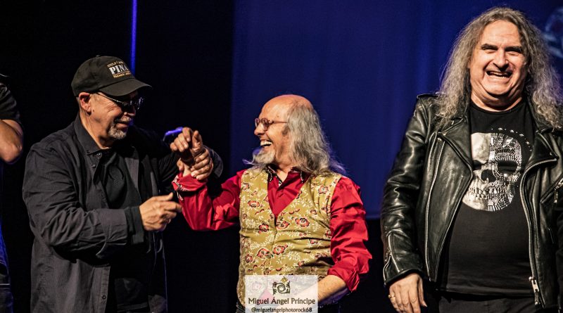 La tarde se fue convirtiendo en noche y la descarga continuó sin tregua con un ambiente más que caldeado que siguió acogiendo «bombazos» como «Un Día Me Largo A Madrid», el irónico, cómico y divertido «Parecían Tontas» del que hay que hacer una lectura correcta escuchando las palabras del propio Luis Miguel al introducirlo y «40», hasta llegar con la compañía de un público que incesantemente cantaba y aplaudía con ganas en los interludios a «Fantasmas Del Pasado», canción en la que un Carlos Pina pletórico se lanzó a la arena con todas sus armas para intercambiar, antes de arrancarse, unas palabras en tono distendido con los músicos homenajeados y darles la enhorabuena por la trayectoria de la banda y su celebración, algo a lo que desde el público un fan le recordó que él lo había celebrado hace poco y que nos hizo darnos cuenta de los dinosaurios del Rock que teníamos delante, hecho avalado por su carrera pero también por su estado de forma y sus tablas sobre las tablas, despertando en todos nosotros esa vitalidad y buen «rollo» que genera la buena música de la que nos gusta rodearnos y los buenos profesionales que la hacen creyendo en ella. Con todo esto a sus espaldas, Pina hizo sobre el escenario todo un despliegue de maestría con su inconfundible puesta en escena, gafas de sol en ristre y esos movimientos con los que acompaña a su voz y que dan una impronta tan singular a las letras que ejecuta, aportando fuerza y vitalidad a las mismas mientras su inconfundible registro vocal entona siempre en la modulación brillante y justa cualquier matiz que un tema requiera.