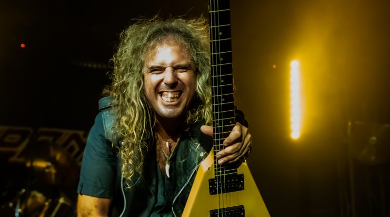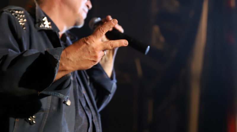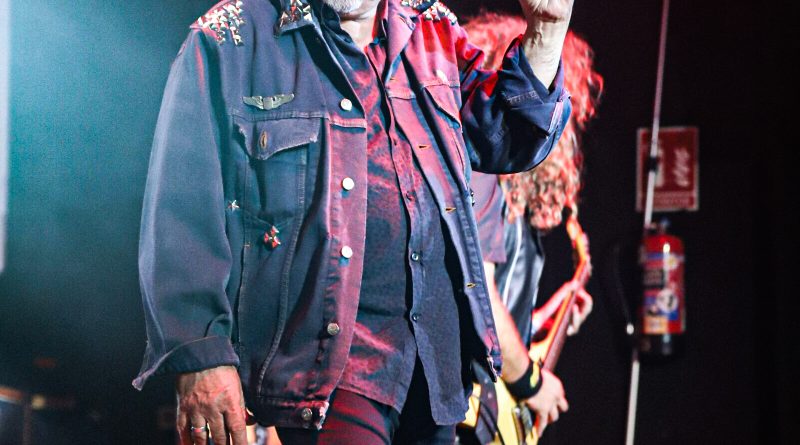 Los aplausos dieron paso a «Número Negro», tema integrado en el disco Toca Madera que acabó con un matiz rememorando al inmortal «Paranoid» de BLACK SABBATH, toda una sorpresa con la que nadie contaba y que dejó nuevamente de manifiesto la inigualable puesta en forma de la banda, quien continuó la «tralla» con otra imprescindible del mismo álbum al arrancarse con «Dios Del Rock» y Carlos subido a la tarima con las manos abiertas dando el pie para introducir en tono suave, sin música y a capella el famoso comienzo «en el octavo día Dios hizo el Rock» antes de que arrancaran los primeros acordes de este tema también incluido en el mencionado disco, un tema de los más exitosos del grupo plagado en su letra de frases cargadas de fuerza y fiereza con estribillo arrollador y con el cual acabó el cantante subido a la tarima de la misma forma que había empezado, cantando de nuevo a capella con el respetable para finalizarlo con agradecimientos en uno de los muchos speech que entre canción y canción se marcó el vocalista y al que en este caso puso fin el «Cachorro» al comenzar arpegiando los primeros acordes del elegante «Caballeros De Sangre», cuyo punteo literalmente clavó recorriendo de arriba abajo y viceversa un mástil que no paró de darnos alegrías durante toda la noche demostrando la variedad de matices con los que ya contaban en época las composiciones de PANZER y cuya temática es toda una declaración de intenciones.