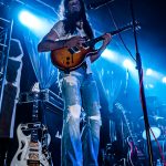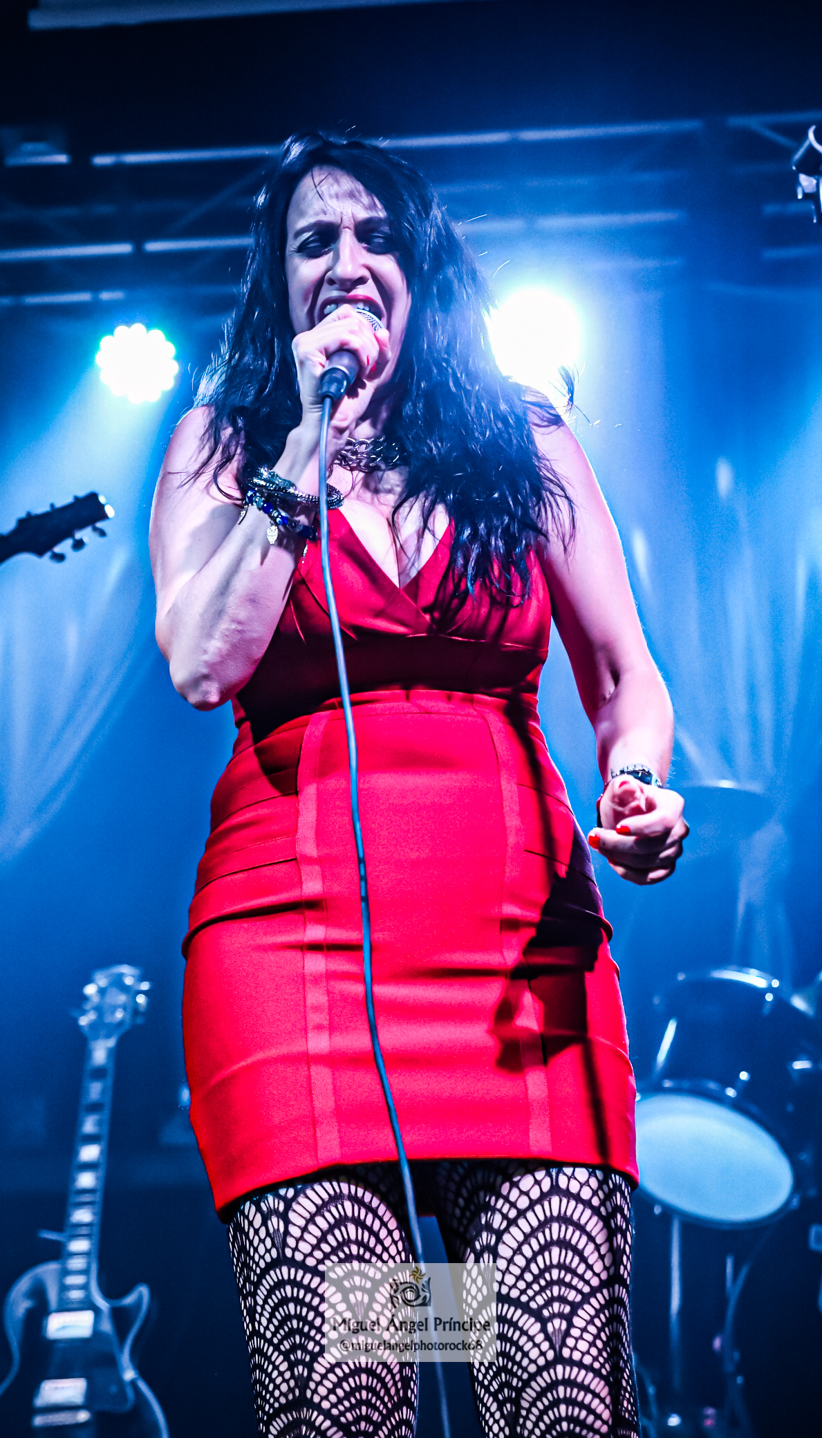 Pilar Muñana abrió la veda anunciando a todo pulmón el primer tema de la noche «Es sólo Un Rock & Roll«, una canción directa y potente que se presentó ya sólo con el título como toda una declaración de intenciones, incluida en su último álbum, con un videoclip editado y que llegó acompañada por parte de la vocalista con palmas en alto animando desde el inicio al respetable, algo que la cantante mantuvo durante toda la actuación mientras sostenía un generoso chorro de voz con el que se metió en el bolsillo a un público totalmente entregado hasta el final al mismo tiempo que, tanto Fernando como Luis, comenzaron a hacer de las suyas moviéndose sobre las tablas para buscar la complicidad de sus respectivas cuerdas de acero y arropar con sus movimientos a una Pilar más que desenvuelta, contando todos ellos con el apoyo de la atronadora batería de Manuel que no cesó en redobles enérgicos y bien gestionados para dar firmeza a las notas de una canción de estribillo pegadizo que cuenta con unos arreglos de extraordinario brillo y una sencillez en la base rítmica nítida, un tema con el cual el grupo puso en movimiento a los allí presentes para no dejarles parar continuando tras los aplausos con «Esclava De Tus Besos», también incluida en su último redondo, la cual ya vio la luz en uno de los recopilatorios en los que ha participado la banda y que mostró a una vocalista con gran variedad de registros modulando su garganta al ritmo de las escalas marcadas por sus compañeros y con generosos riffs por parte de Reguero, quien no paró de moverse por el escenario durante la hora y media de directo mientras recorría el mástil de su guitarra con gestión rápida de muñeca en la zona del traste y derroche de talento en los medidos punteos que se sucedieron con brillo y buen gusto.