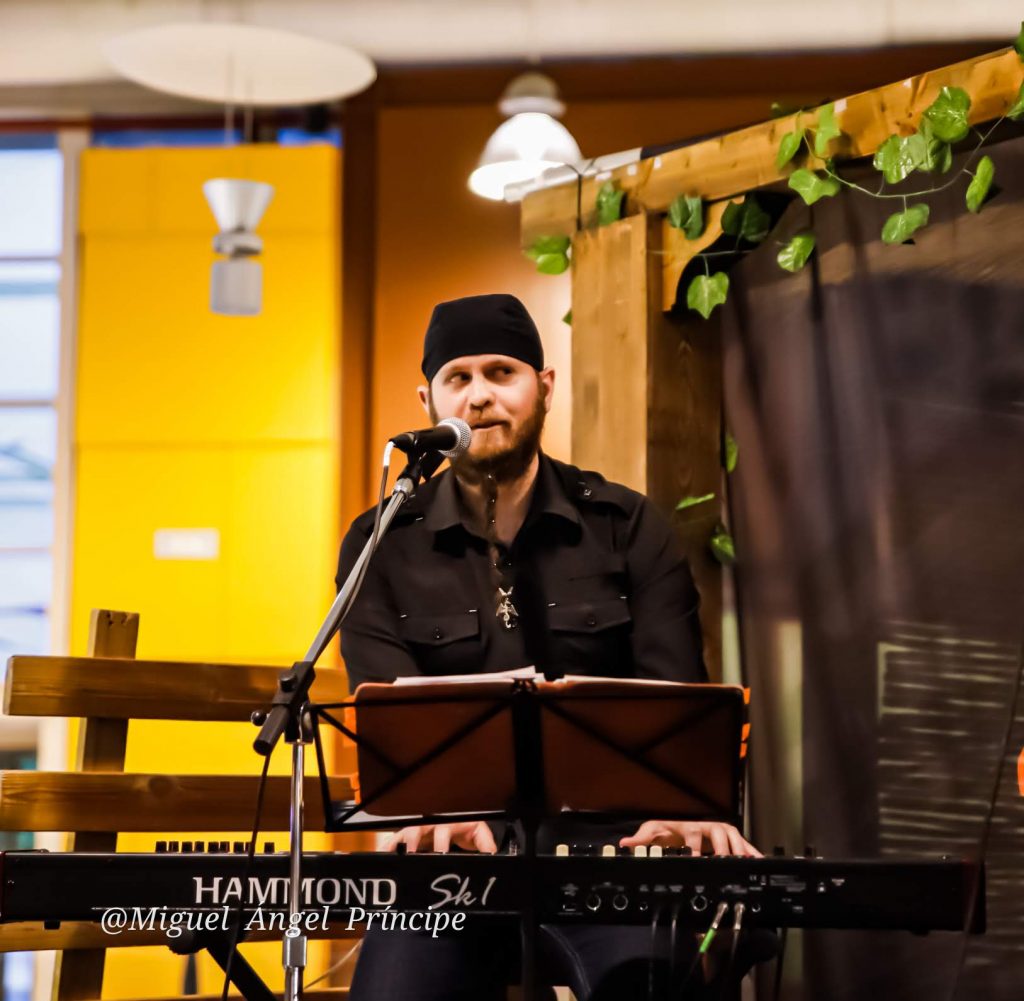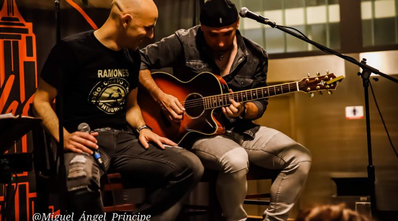 Otra sorpresa de la noche llegó con «Loosing My Religion», un tema de R.E.M. que se marcó también Miguel Ángel con maestría rítmica guitarrera a la que acompañó con su propia y amable voz, encarando una canción en la que le vimos muy cómodo tal vez por estar más cercana a sus tonos vocales y porque también en el acústico adquirió un ritmo muy personal, con acordes muy marcados y cercanos al Rock And Roll sobre todo en un final de punteos lenta y elegantemente prolongados para acabar un tema al que Marcos regaló unos teclados finos y dulces, redondeando así una canción que marcó un cambio de tendencia musical en esta formación estadounidense y pasando a continuación, tras dedicatoria especial de Leal a su compañera Mer allí presente, al tema «Angel», de interpretación definida y rico en arpegios de la guitarra que dominaron la canción de principio a fin en lo que casi podríamos denominar como una sucesión de riffs, al dominar las seis cuerdas tanto el ritmo armónico como los solos combinándolos con una exquisitez muy apreciada por el personal que aplaudió a rabiar el final de un tema que nos sumergió en una sucesión de cambios de estilo que defendieron sin problema al interpretar «La Chica De Ayer» de NACHA POP, «Tu Frialdad» de TRIANA y «Mil Calles Llevan Hacia Ti» de LA GUARDIA, muestra todos ellos impagable de la increíble capacidad de gestión vocal de Miguel Ángel al cambiar con facilidad de estilos y ritmos, imprimiendo a todos ellos su propia personalidad sin que la canción pierda un ápice de su esencia como también ocurrió con un himno del Heavy Metal nacional de la mano de SOBREDOSIS y su ya casi épico «Alíate», una canción que Leal ha interpretado en varias ocasiones y que nos retrotrae a épocas doradamente pretéritas en las que el Metal nacional vivió tiempos de gloria con fans genuinos e ideología de raza, inamovible y, en cierto modo cargada de maravillosa ingenuidad.