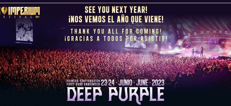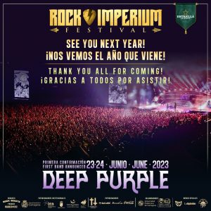 Cuando aún resuenan los ecos del Rock Imperium 2022 celebrado en Cartagena los pasados días 24 y 25 de junio, la organización ya ha dado a conocer al primer grupo que participará en la edición 2023, siendo la legendaria formación DEEP PURPLE una de las indiscutibles protagonistas de esta masiva celebración que poco a poco irá configurando el nuevo cartel para un evento que tendrá lugar los días 23 y 24 de junio de 2023, estando los abonos ya a la venta en la propia web del Festival con una oferta de lanzamiento de entradas.
