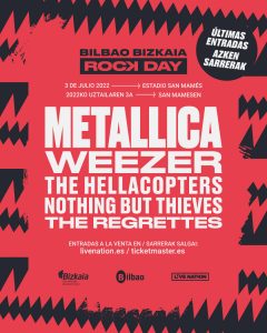 METALLICA llega al Estadio De San Mamés (Bilbao) el próximo domingo 03 de julio dentro de la programación del Bilbao Bizkaia Rock Day. La banda estará acompañada por WEEZER, THE HELLACOPTERS, NOTHING BUT THIEVES y THE REGRETTES en una jornada de ocho horas de Rock y Metal que será una fiesta por todo lo alto para celebrar la versatilidad del género, reuniendo a artistas de diferentes generaciones y estilos pero unidos por un mismo patrón que va desde el Trash Metal de METALLICA hasta el Pop Rock de los THE REGRETTES pasando por el Rock Alternativo de WEEZER, el Garage Rock de los THE HELLACOPTERS y el Indie Rock de NOTHING BUT THIEVES.
