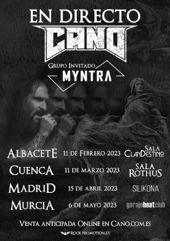 La próxima parada será el sábado 11 de marzo en la Sala Rothus de Cuenca junto a los locales MYNTRA, quienes descargarán su primer EP Génesis mientras que CANO, repasará sin remisión sus discos La Zozobra y La Encrucijada estando ya disponibles las entradas anticipadas por 10 € a través de Inicio – Cano.com.es y con un precio en taquilla de 15 € para disfrutar de una auténtica noche de Heavy Metal.
