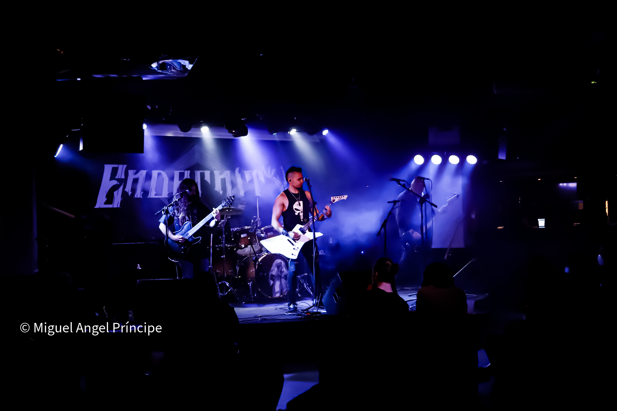 Con los primeros aplausos de bienvenida y un público ya puesto en situación, comenzaron ENDERNITY a dar «tralla» con el primer tema de la tarde llamado «Ashes And Dust», una canción que fue abierta por la batería e inmediatamente seguida por las guitarras y el bajo que formaron como frontmens un trío perfecto durante todo el espectáculo. El inicio con voz gutural del cantante ya empezó a demostrar lo compacto de las cuerdas vocales de Manu, que regaló matices durante toda la actuación mientras en este primer tema disfrutamos del perfecto empaste de las percusiones que demostraron el bajo y la batería con un entendimiento perfecto que imprimió personalidad a la canción y facilitó el deleite en riffs de sus compañeros a las seis cuerdas en una canción fiera que permitió un lucimiento a los headbanging de Rodri, quien no paró de gestionarlos durante todo el directo mientras acompañaba a los coros y se repartía los punteos con Manu, que daba buena cuenta de ellos mientras derrochaba en registros pasando de un tema a otro y dentro de las propias canciones cambiando el ritmo de la voz especialmente en este tema, que apuntó en ciertos momentos a un incipiente Nu Metal.