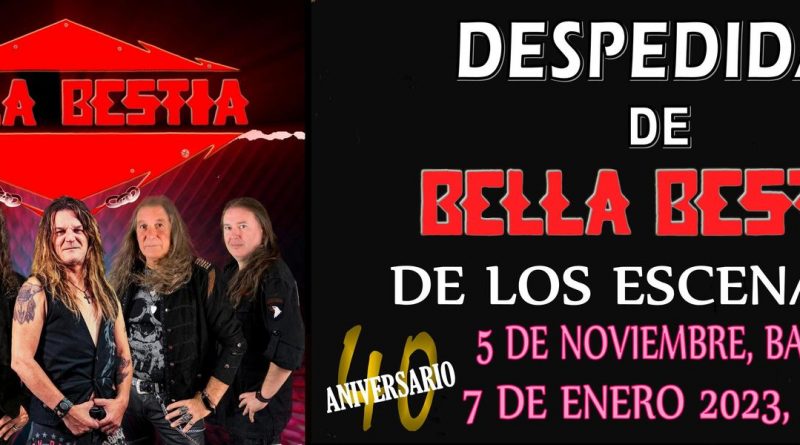 Tras el anuncio de la semana pasada del fin de su trayectoria musical, después de 40 años sobre los escenarios, BELLA BESTIA publica las fechas de sus dos conciertos de despedida que tendrán lugar en Barcelona y Madrid, acompañados en ambos por CRASH BONES. La penúltima ocasión de ver a la banda en directo esta ya prácticamente a la vuelta de la esquina, tendrá lugar el 5 de noviembre en la Sala Bóveda de Barcelona, Ya puedes comprar tú entrada en los puntos de ventas Anticipadas, Discos Riff-Raff, Pentagram Discos, y Online, Wegow. El ultimo y definitivo concierto será el 7 de enero del 2023 en en Sala Nazca de Madrid. Puntos de ventas entradas anticipadas Ticketfever.es, Telón de Acero, Calhouse Rock Bar, El Mono, La Mazmorra, VKaos, Texola Club de Rock, y Online, Ticketfever.es y Wegow