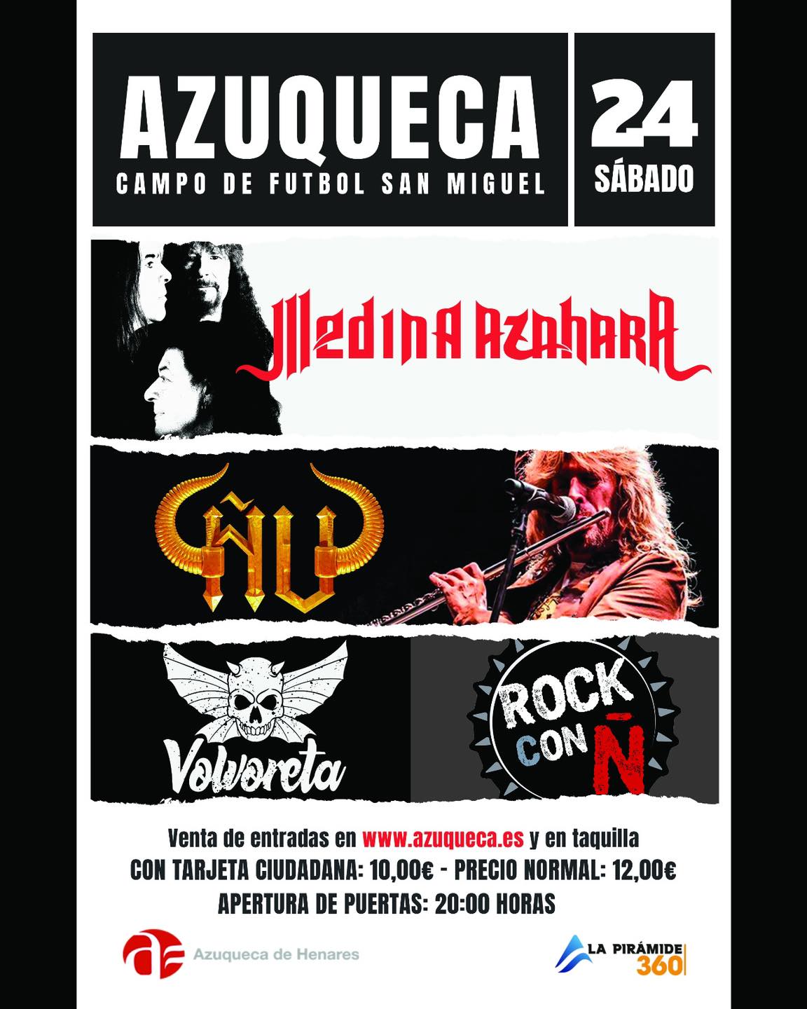 Que mejor manera para despedir el verano y dar la bienvenida al otoño que con un buen festival de rock. Este próximo sábado 24 de Septiembre tendremos la oportunidad de hacerlo, de la mano de MEDINA AZAHARA, ÑU, ROCK CON Ñ y VOLVORETA en la localidad de Azuqueca de Henares. COMPLEJO DEPORTIVO SAN MIGUEL (CAMPO DE FUTBOL S/N)