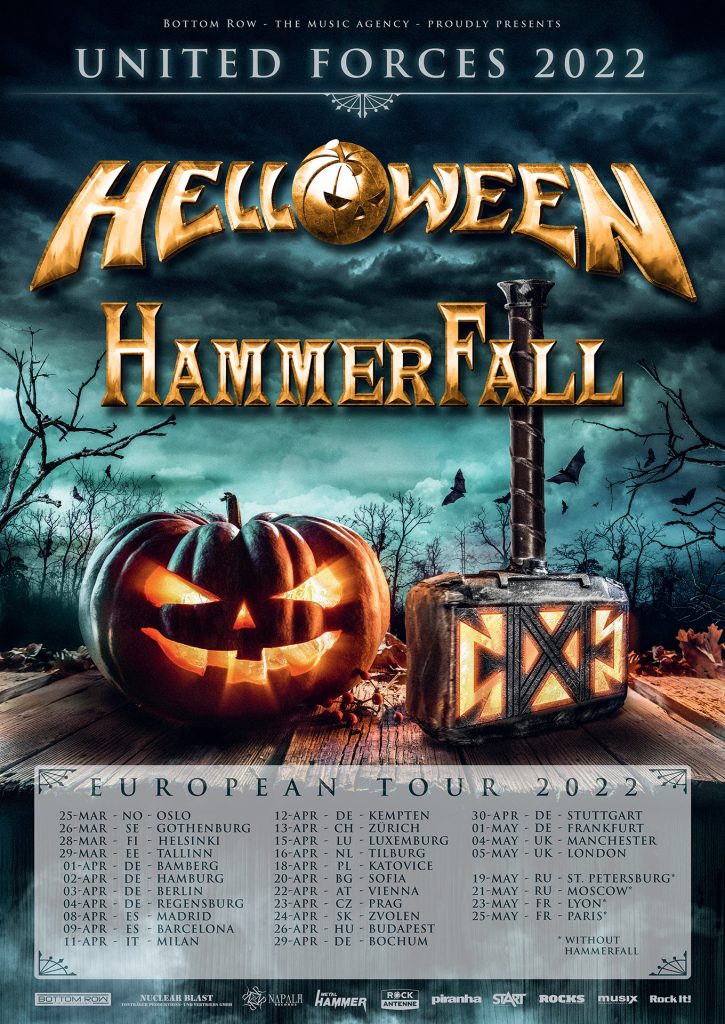 Todos tenemos que unir fuerzas y aguantar este parón agónico de la música en directo pero ya que las circunstancias extraordinarias requieren medidas extraordinarias, HELLOWEEN han invitado a sus amigos de HAMMERFALL a unirse a la gira europea para crear un pack de Heavy Metal tremendo. La gira UNITED FORCES TOUR 2022 no solo llevará la experiencia completa de HELLOWEEN a cada ciudad sino también el acero sueco de la forja de HAMMERFALL. Ambas bandas tendrán nuevos discos bajo el brazo y los fans europeos podrán escuchar los temas en directo por primera vez en el UNITED FORCES TOUR 2022. El final de la sequía está en el horizonte y con una doble dosis.