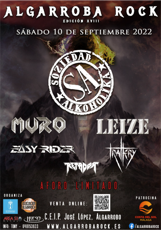 Algarrobo, un pueblo costasolense de trazado morisco ubicado a 32 kilómetros de Málaga en plena comarca de la idílica Axarquía, acoge un año más su exitoso Festival con el Rock y el Metal por bandera, un evento que este año 2022 se celebrará el sábado 10 de septiembre a partir de las 16:00 horas en el C.E.I.P. José López con un cartel de lujo y manteniendo el compromiso firme con música, bandas e incondicionales seguidores que siempre han arropado este ya imprescindible evento.