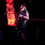 Tras esta broma que puso más calor en el público, subió de nuevo Mer a escena para reventarnos con su demoledora garganta plasmada en «One By One» que a su vez dio pasó a «The Phantom Of The Opera» de NIGHTWISH, en el que la cantante apareció acompañada de una performance espectacular al presentarse en escena con una capa y capucha blancas junto con unos guantes que brillaban con un verde eléctrico a lo largo de los dedos y que comenzó a mover creando ese ambiente misterioso que el comienzo requería acompañada también en el espectáculo por luces tenebrosas y por las manos virtuosas de Santonja, que volvió a escena juntándose tres guitarras en la misma totalmente volcadas en acordes perfectamente enlazados entre ellos y con un teclado que aportó una base rítmica impecable y elegante además de unos coros guturales que dieron realismo a la canción.