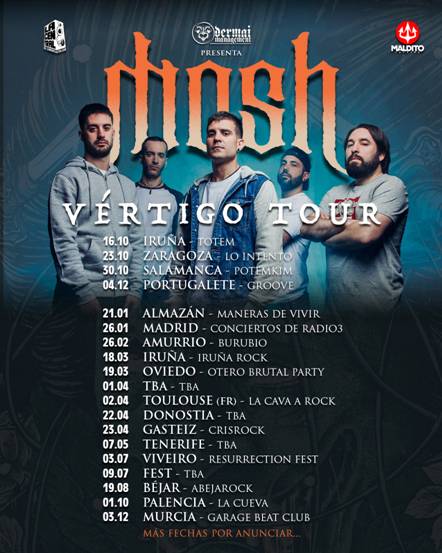 La joven banda navarra MOSH, recorrerá gran parte de la geografía nacional con su Vértigo Tour para presentar su recién editado trabajo llamado Vértigo, un disco que ya está a la venta con diez cortes en su interior llenos de Thrash, Hardcore, Punk y Metal con desenfrenados ritmos y unos estribillos hipnóticos.