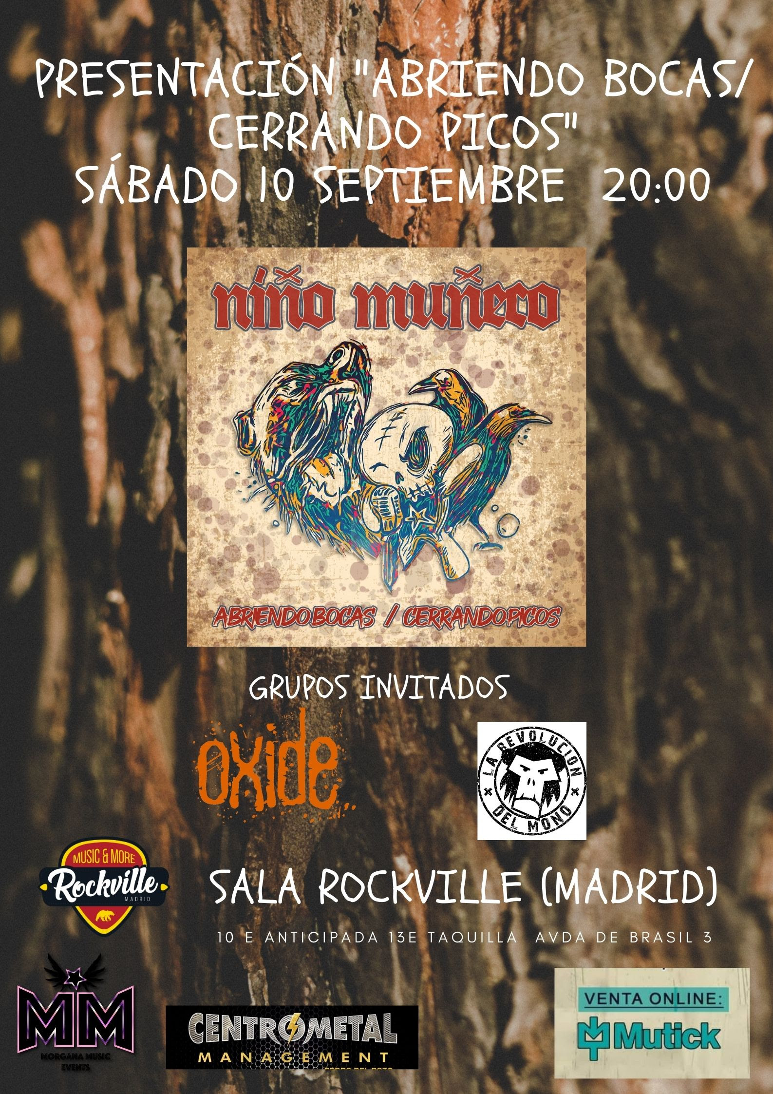 Tras su inicio vertiginoso en el mundo musical, NIÑO MUÑECO que acaba de editar su primer trabajo Abriendo bocas/Cerrando picos, estarán presentándolo el próximo sábado 10 de Septiembre en la Sala Rockville de Madrid junto a OXIDE y LA REVOLUCIÓN DEL MONO