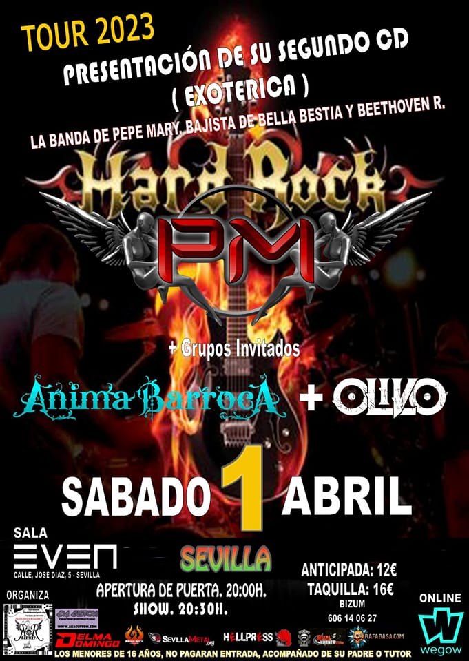 PM, la banda de Pepe Mary, bajista de BELLA BESTIA y BEETHOVEN R, anuncia el comienzo de la gira de presentación se su segundo trabajo Exóterica el 1 de abril en Sevilla en la Sala Even, y estarán acompañados de los grupos invitados ANIMA BARROCA y OLIVO,