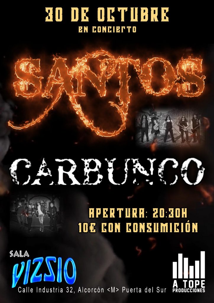 Será una noche cargada de buen Rock y Heavy Metal que contará con dos grandes bandas del roster de A Tope Producciones; por un lado SANTOS, un grupo formado en 2016 por su Guitarrista Carlos Santos que desde los inicios apostó por sonidos que van desde el Blues Rock al Hard Rock pasando por el Rock And Roll o el Heavy Metal. Tras el parón obligado debido al confinamiento durante la pandemia, SANTOS se lanza a componer nuevos temas y en el año 2020 sale su nuevo y hasta ahora último trabajo La Isla De Los Sueños en formato EP.